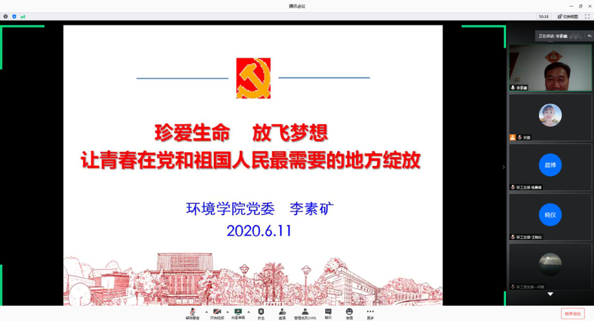 他结合学院近年来推进习近平生态文明思想“三进”和人与自然和谐共生教育,回顾了美丽中国“4+N”环境地球科学类课程思政建设计划、张国旗班行动计划、1+6党建资政育人载体建设进展情况。在谈到做大爱之人时,他强调,做一个博爱之人,树立大爱情怀,做到爱党爱国爱家爱校爱学爱习,争做新时代生态环保铁军。在谈到做合格党员时,他强调,一定要牢记总书记嘱托,不惧风雨、勇挑重担,让青春在党和人民最需要的地方绽放绚丽之花。要遵守党章、加强党性,要坚定信念、加强学习,遵纪守法、廉洁正派,要向榜样学习、向群众学习,做四讲四有的合格党员。