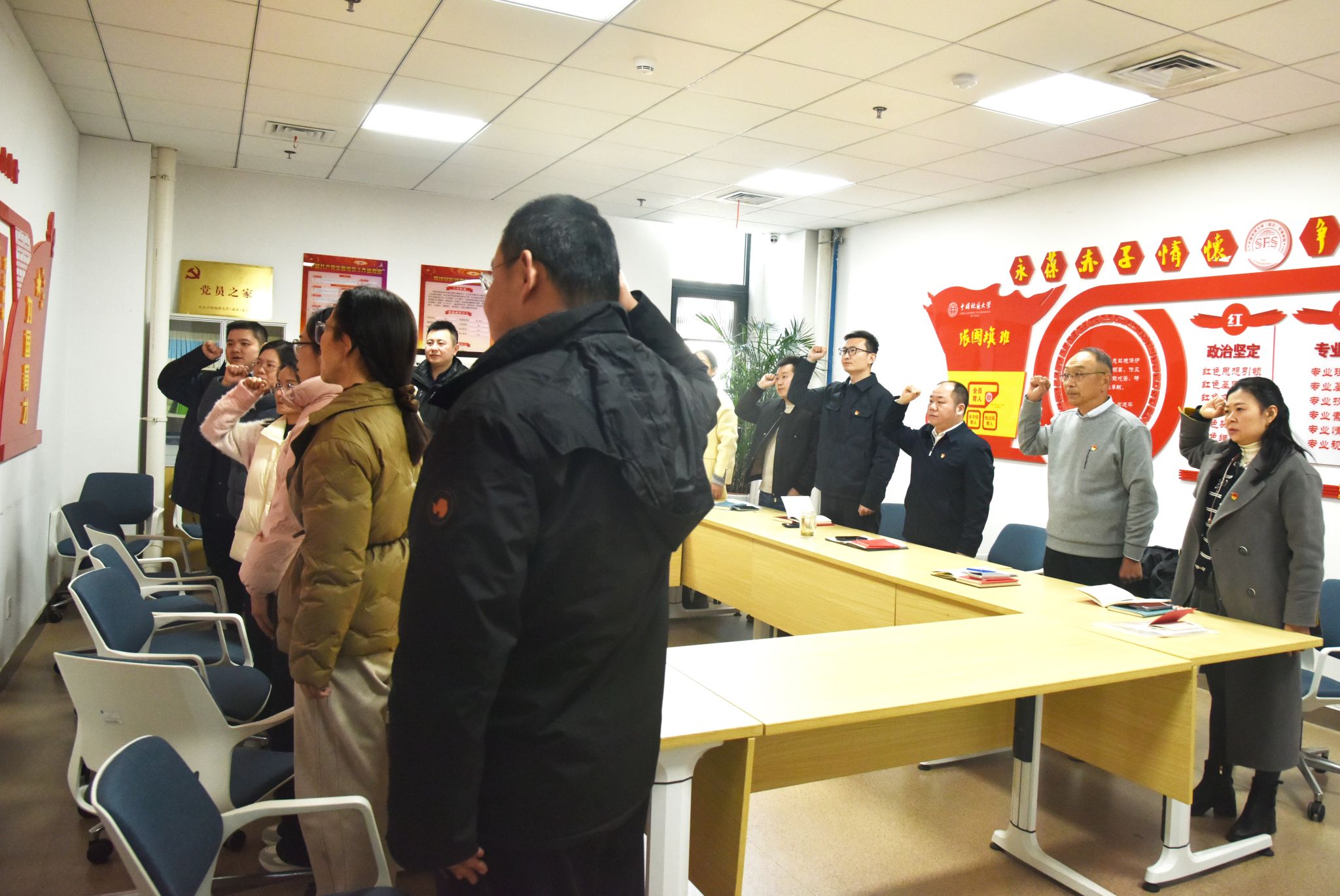 支部党员唱国歌、温誓词。