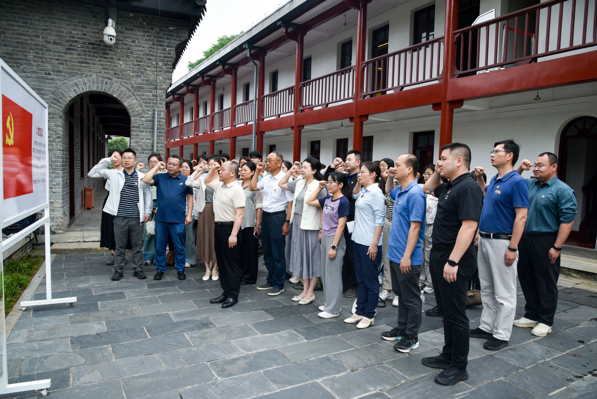 活动伊始,全体师生党员代表面向鲜红党旗重温入党誓词,学院党委书记姜明敏领誓。