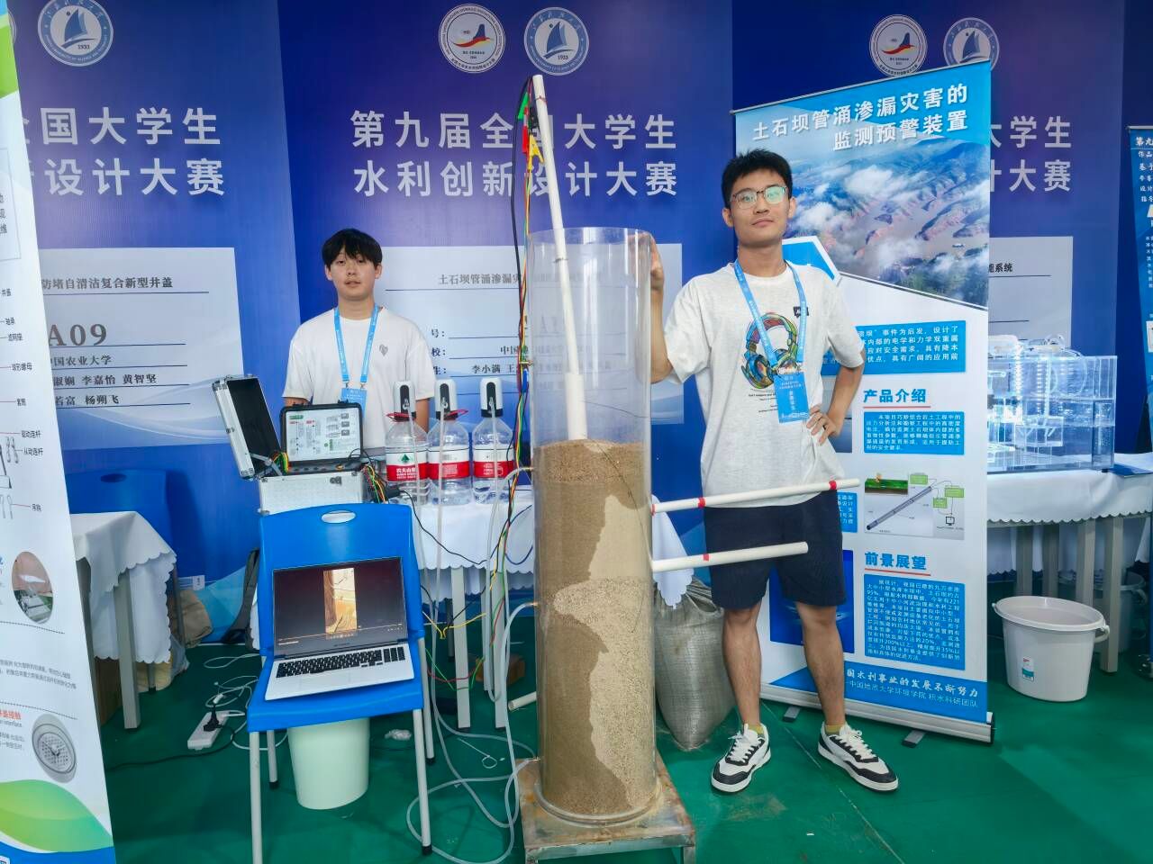 我院一等奖作品展示:“土石坝管涌监测预警装置”项目由马传明、潘欢迎两位老师指导,团队成员有李小满、王馨、杨鲁豫、周莉和周鸣谦。该项目针对中小型土石坝监测成本高、人工滞后问题,创新水力学-电学融合技术,集成孔隙水压力传感器与高密度电极,实时同步监测坝体含水率与应力变化。通过双参数分析实现管涌风险早期精准预警,装置结构简易(PVC管+导线组合)、全自动运行、安装便捷且不破坏坝体,为水库安全提供低成本高效解决方案。