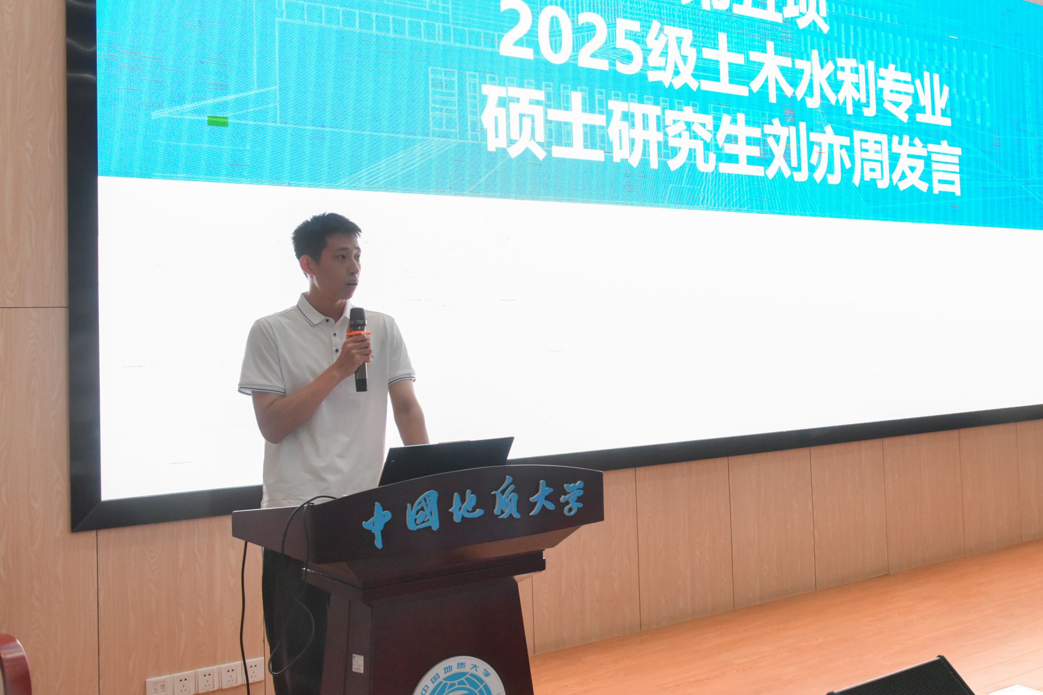 新生代表、2025级土木水利专业硕士研究生刘亦周发言。他以自身经历激励同学们勇于克服困难、迎难而上,并以“在学习中强化理想信念、在科研中锤炼过硬本领、在实践中厚植担当底色”与同学们共勉。