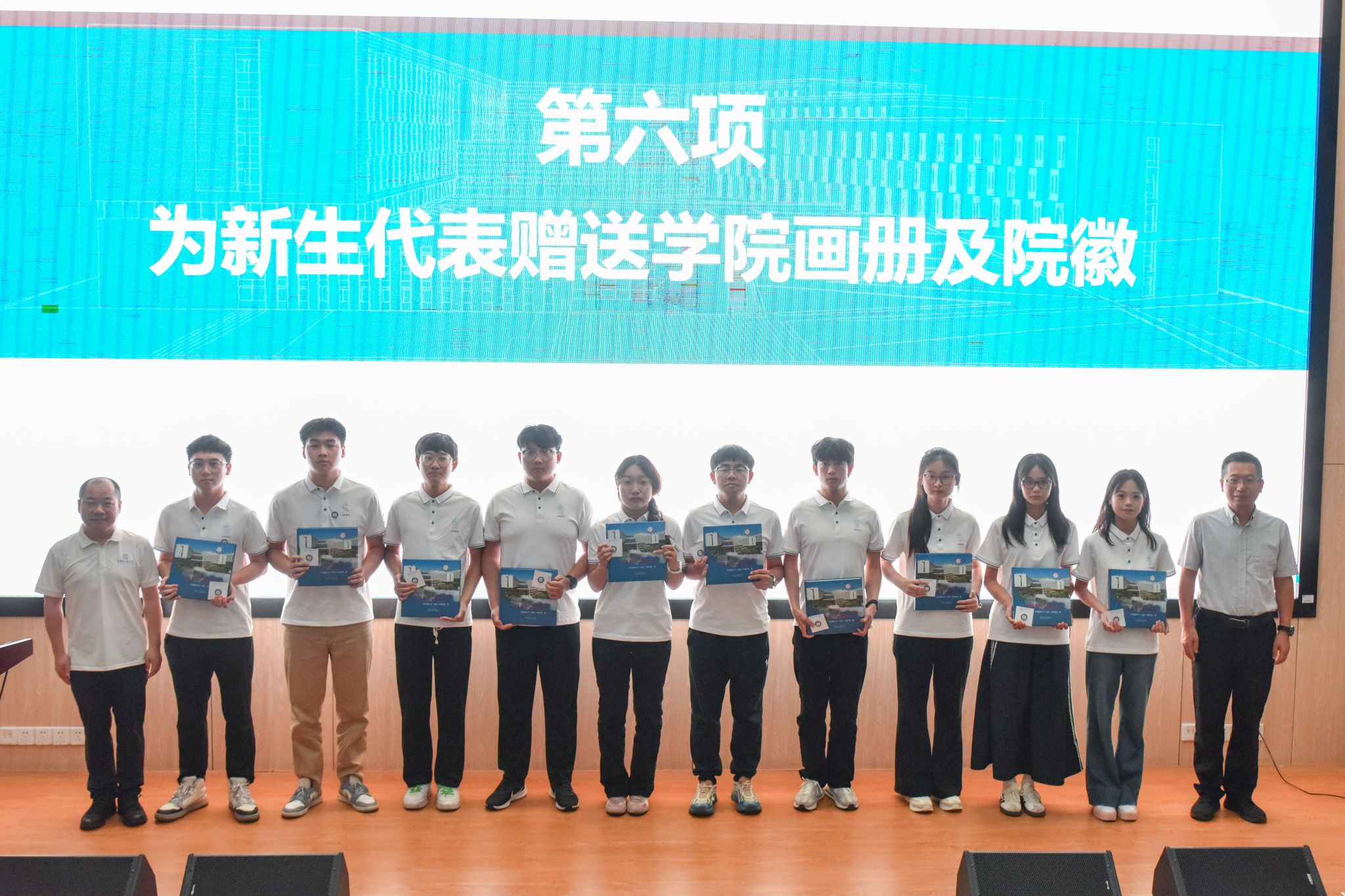 学院党委书记姜明敏、院长史建波为各班新生代表赠送学院画册及院徽。