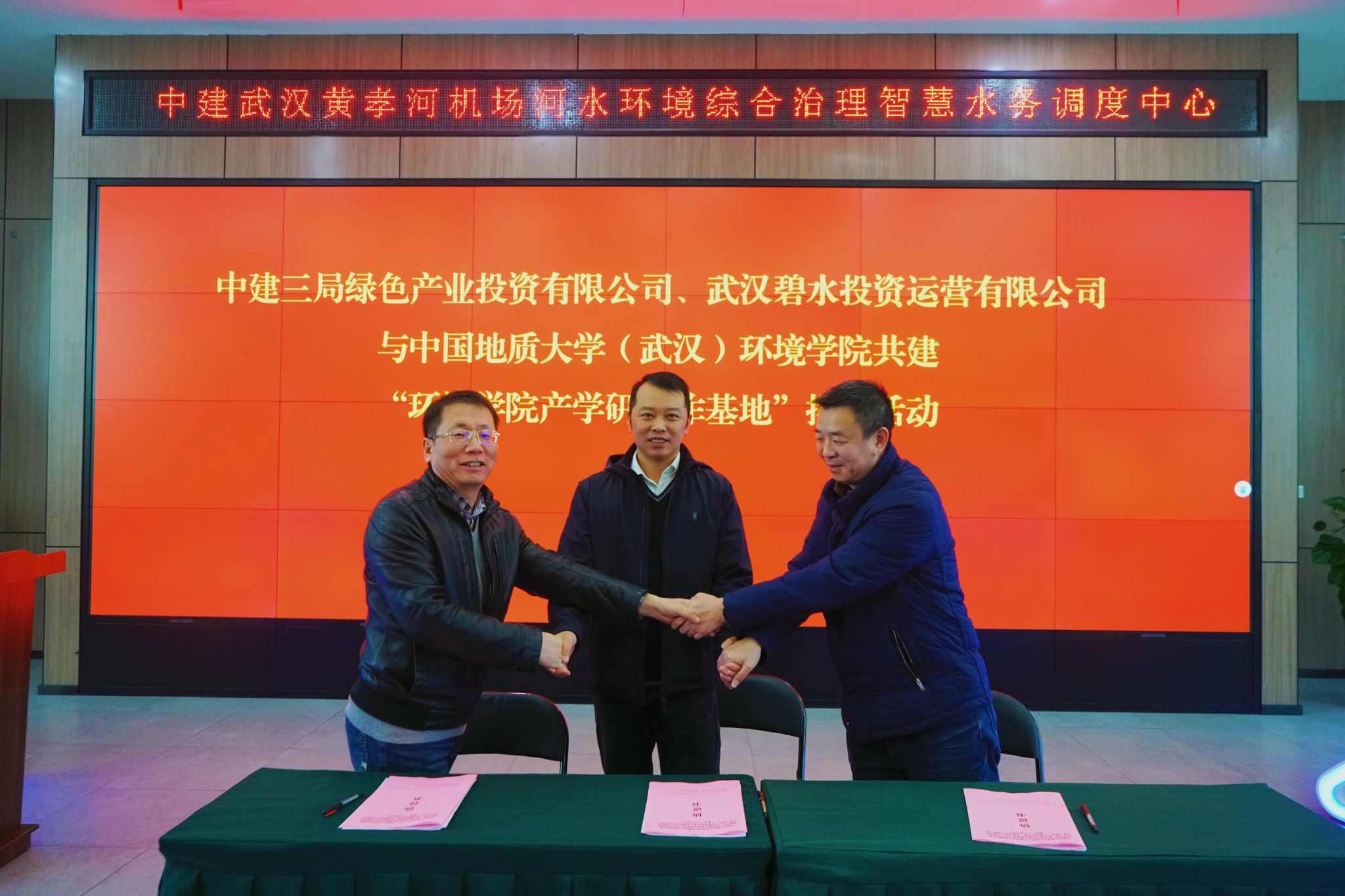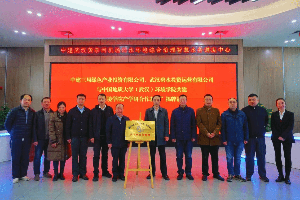 中建三局绿投公司党委副书记、工会主席舒国荣,水务环保事业部工会主席武念,黄孝河机场河二期项目负责人李进,运营项目联合党支部副书记胡刚以及武汉碧投公司黄孝河机场河项目公司董事林华,生产运管中心副部长邓聪,黄孝河机场河项目公司副总经理王骏等参加揭牌活动,WilliamHill中文官方党委书记姜明敏,环境系教师李立青、皮坤福、颜诚,学院办公室主任刘凤莲等一行参观了中建武汉黄孝河机场河水环境综合治理智慧水务调度中心,三方开展座谈交流并举行揭牌仪式。仪式由绿投公司水务环保事业部工会主席武念主持。
