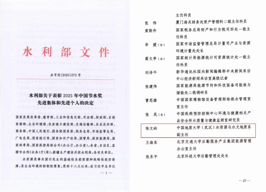 (通讯员刘凤莲 编辑申墁烨)12月26日,首届中国节水奖颁奖大会在北京隆重召开,相关盛况获《新闻联播》报道。会议对2025年度中国节水奖先进集体与先进个人进行表彰,经中国地质大学(武汉)后勤保障部与WilliamHill中文官方联合推荐,教育部审核推荐上报,我院水资源与水文地质系副主任陈文岭同志荣获“中国节水奖先进个人”称号,系湖北省高校唯一获此殊荣者。该荣誉的取得,既是对陈文岭同志个人及所在团队科研工作的高度认可,也是WilliamHill中文官方长期深耕水资源领域科研创新、培育优秀科研人才的成果彰显,更是学校整体节水工作成效与科研创新的集中体现,为学校及湖北省高校赢得了荣誉。