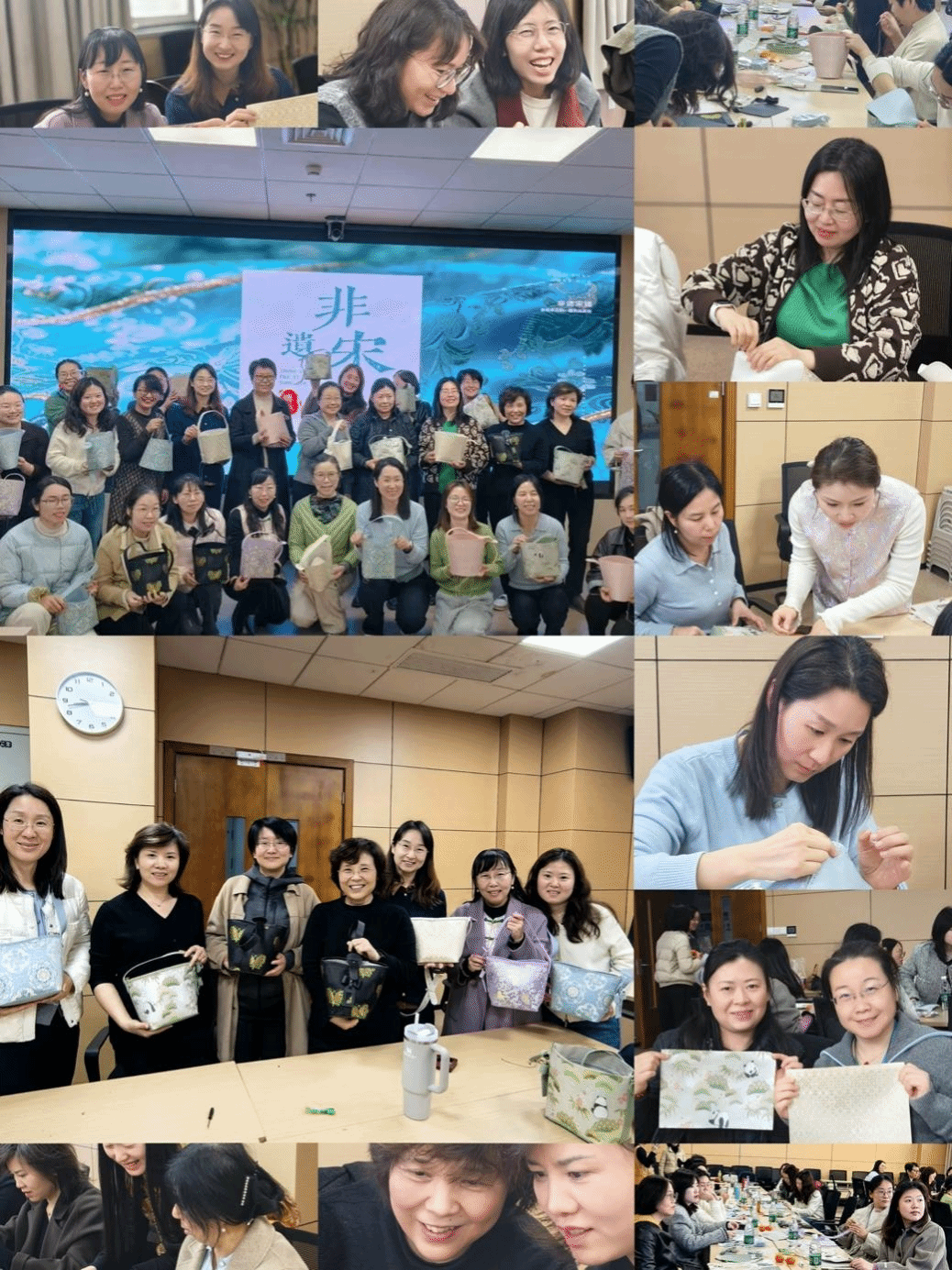 在随后的制作环节中,老师为大家分发了预先裁好的宋锦纹样布料及各类配件,并逐步演示了如何将这些材料组装、缝制成一只精美的手提包。女教工们纷纷拿起针线,精心挑选自己喜爱的宋锦花色,认真比对配件位置,细心缝制拼接。现场气氛热烈而专注,大家时而互相交流缝制技巧,时而向老师请教细节,欢声笑语不断。经过近6个小时的精心制作,一个个古朴典雅、独具匠心的宋锦手提包陆续诞生,大家纷纷举起自己的作品拍照留念,成就感溢于言表。