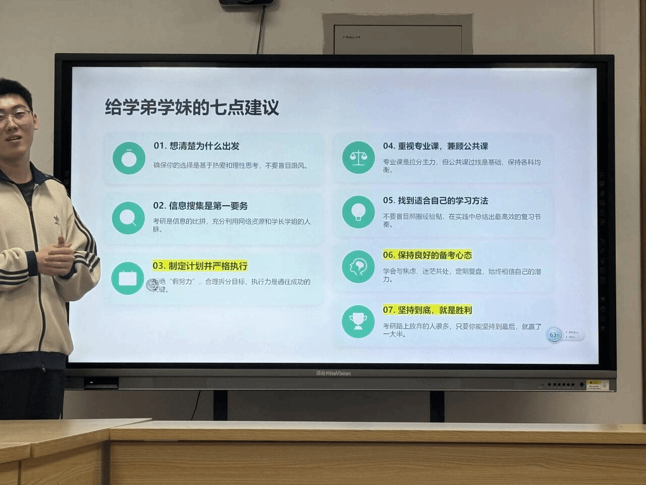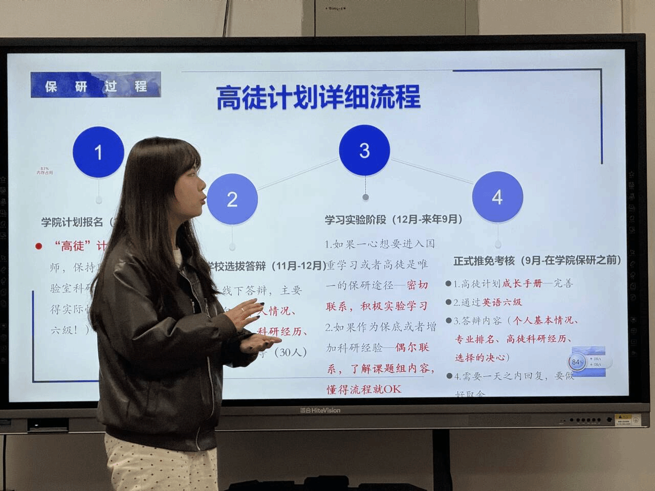 经验分享环节,四位优秀学生结合自身经历,分别从不同角度介绍了升学备考经验。保研至浙江大学的周莉同学围绕推免条件、时间安排、材料准备和面试经验进行了分享;考研至华中科技大学的汪晶同学介绍了分阶段备考方法和复习节奏安排;考研至南京大学的王佳嘉同学结合备考过程,建议同学们根据自身基础合理选择目标院校,并保持稳定的学习状态;跨考至西北工业大学的宋嘉琦同学分享了跨专业备考的准备过程,鼓励同学们结合个人兴趣和能力,主动拓展发展方向。