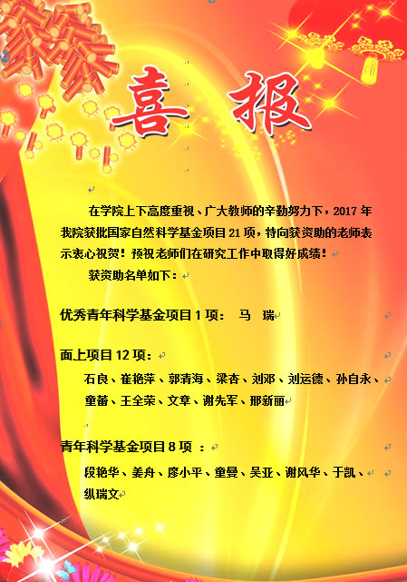 2017年我院获批国家自然科学基金数多项