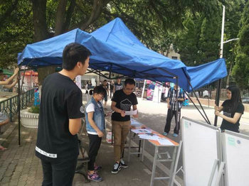 (左图为小组成员们在搭帐篷,右图为大学生们询问)