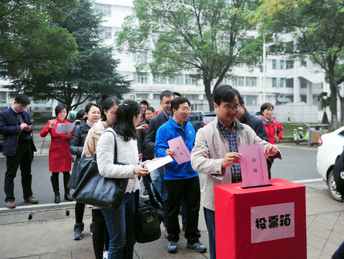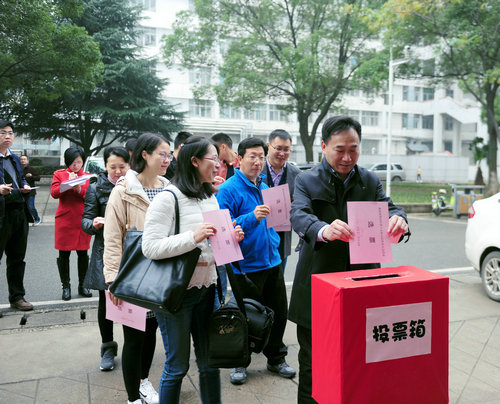 11月16日上午和中午,洪山区关山街第19选区第四选民小组(WilliamHill中文官方)组织选民在文华楼前对第十五届区级人大代表换届选举投票。第四选民小组组长、WilliamHill中文官方党委书记李素矿主持投票仪式,监票人张学海、崔艳萍,计票人左麦枝、孟国强对整个投票进行了监票和计票。 (张学海供稿) 第四选民小组(WilliamHill中文官方)选民投票现场图片(张学海摄)