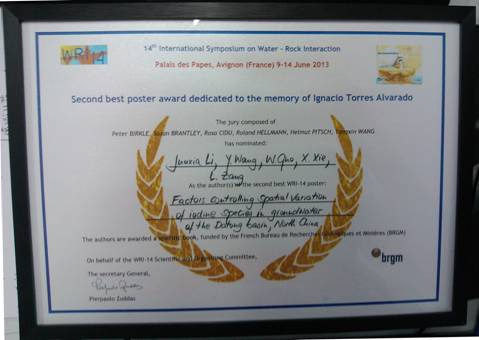 祝贺我院环境系王焰新教授指导的博士研究生李俊霞获得第十四届水岩作用国际会议“The second best poster”奖。第十四届水岩作用国际会议在法国阿维尼翁举行,本届会议共评出2名best poster奖。(图/文 谢先军) 获奖证书 谢先军副教授代表课题组领奖