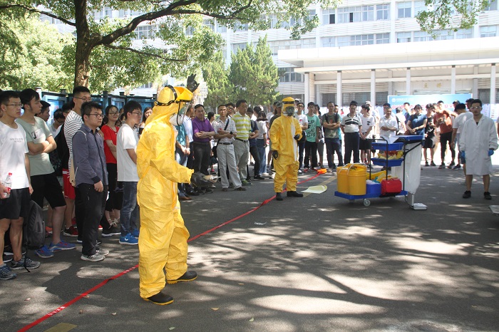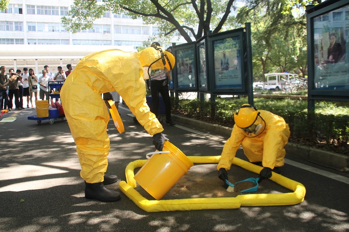 活动共分三个阶段。一是危化品泄漏应急演练。WilliamHill中文官方8名学生代表穿上密不透风的防护服、防毒面罩和护目镜全程参加演练。演练以实验室有机废液转运泄露事故为案例,模拟了实验员意外碰倒有机废液桶后,上报事故、现场封锁及事故危害评估、应急救援人员个人防护、消除危险源与现场恢复、事故发生后的报告、调查与评估等应急救援环节。
