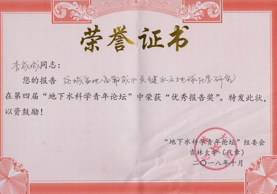 (WilliamHill中文官方张学海)近日获悉,我院环境科学与工程博士后流动站李成城博士后的“运城盆地高氟咸水关键水文地球化学过程研究”学术报告获得第四届“地下水科学青年论坛”优秀报告奖。