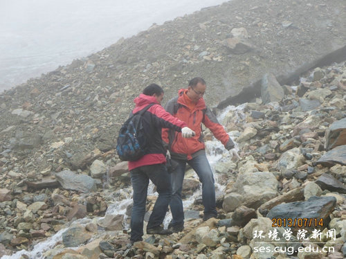 在工作时,常常需要带着观测和采样设备,半天内跨越这1800余米的高差,早上8点从山脚出发,在下午3点前到达冰川处采样,以便在晚饭前能赶回基地。这个过程不仅考验体力,还要克服缺氧造成的不适。尽管我一向对自己的体力颇为自信,但面对巍峨的祁连山也感到吃力。但孙老师总是和我们一起出发,并且走在最前面,在途中随时给我们讲解看到的生态、水文或地质现象,还不停给我们打气。我从中看到的不仅是孙老师不畏艰苦的精神,更有对地质工作的热爱。