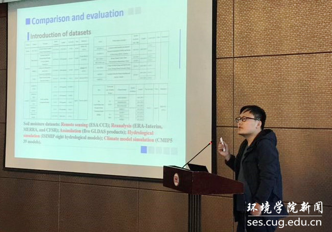 我院特任副教授顾西辉老师在会议上进行了交流。他提出:在欧亚大陆的土壤水分干旱有显著的强化和扩张,这是降水减少和气温升高共同作用的结果。降水的变化影响着土壤水分变化的方向,而温度的升高决定着干旱的程度。降水和温度的影响取决于蒸发蒸腾作用,并可以提取干旱过程中的全球变暖信号。他发现全球土壤水分减少4.2×10-3m3 / m3,温室气体的贡献50%。