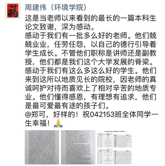 作为答辩组的周建伟老师看了郑可论文的致谢词后非常感慨在朋友圈写到,这是当老师以来看到的最长的一篇本科生论文致谢,“感动于我们有一批多么好的老师。他们兢兢业业,任劳任怨,以自己的德行引导着学生成长。不管他们职称是讲师还是副教授,他们都是我们这个大学发展的脊梁。感动于我们有这么多这么好的学生。他们来到这所以地质见长的院校,因老师的真诚呵护对待而喜欢上了相对辛苦的地质专业。他们懂得感恩,有理想有追求,他们是最可爱最有途的孩子们。”
