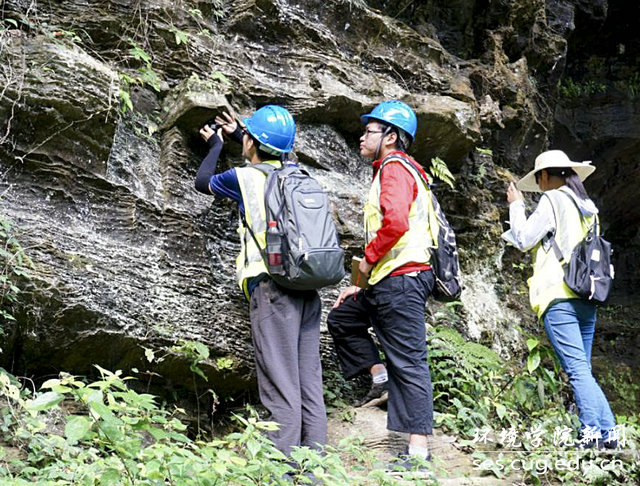 学生在泗溪鱼泉洞测量岩石产状