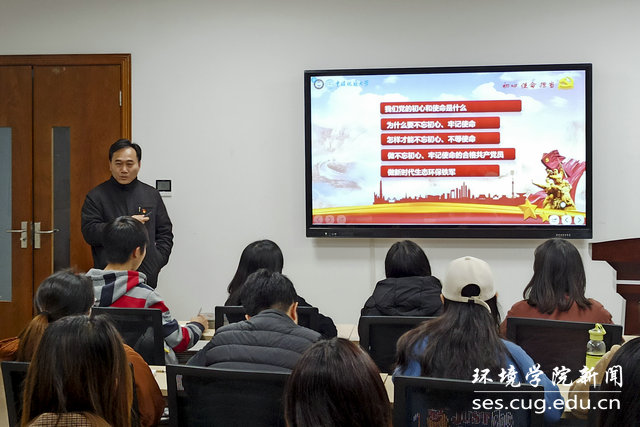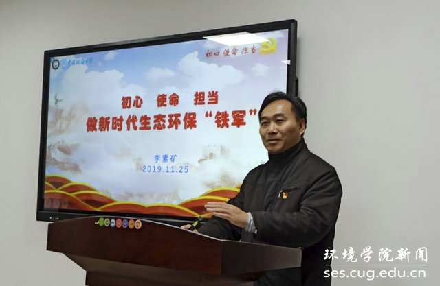 李素矿带领班级同学重温十九大主题:不忘初心,牢记使命,高举中国特色社会主义伟大旗帜,决胜全面建成小康社会,夺取新时代中国特色社会主义伟大胜利,为实现中华民族伟大复兴的中国梦不懈奋斗。并从我们党的初心和使命是什么,新时代为什么要不忘初心、牢记使命,怎样才能不忘初心、牢记使命,如何做新时代的合格共产党员和生态环保“铁军”等方面进行讲授。