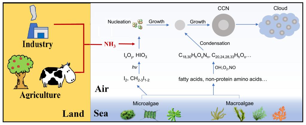余欢教授近期利用高分辨质谱解析、量子化学计算和团簇生长动力学模拟等手段,首次研究了海洋源有关的挥发性气体碘、氨气以及脂肪酸等经过一系列大气化学反应最终生成大气新粒子的机制(如图所示)。由于海洋占据地球71%的表面积,这一海-气物质交换机制会显著贡献到地球辐射平衡和全球气候变化。