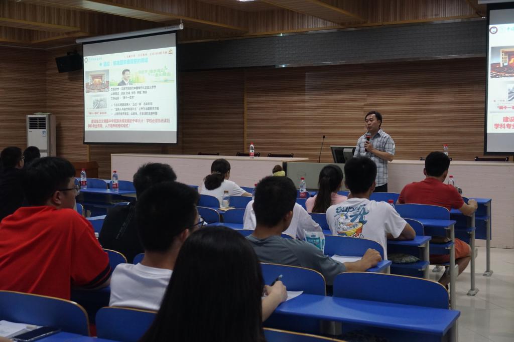 院党委书记李素矿以坚持用习近平生态文明思想定位“自己”为主题讲授党课。他从习近平生态文明思想的深刻内涵、美丽中国宜居地球迈向2030、锻造培育生态环保铁军的摇篮、打造新时代合格生态环保铁军等四方面进行讲授。他介绍了学校办学思想大讨论基本安排,从学院发展角度要求师生要坚持用习近平生态文明思想科学定位自己、精心规划自己,充分结合学院学科特点、专业特色和教育教学规律、师生发展规律,瞄准国家行业、聚焦集体事业、规划个人职业。他鼓励同学们要努力提升专业水平,主动思考、积极参与学院和学校建设发展,为中国梦、地大梦、环境梦的实现贡献自己的智慧与力量,争做红专能优新时代生态环保铁军。