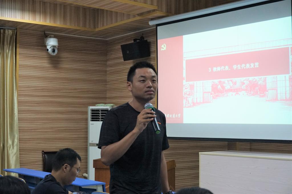 045191班班长李天奇代表班级同学分享了实习感受。他说,同学们在实习过程中感到非常快乐与新奇,在愉快轻松的氛围下学到了许多课本上没有学到的知识。但由于专业课学习不够多,致使野外岩性识别与构造描述方面有些吃力。041171班毛烁宇、042174班易佳佩和毕广宇根据自己的实习实践学习经验,进行分享并鼓励2019级中加班新同学,耐心学习一定会有所收获。