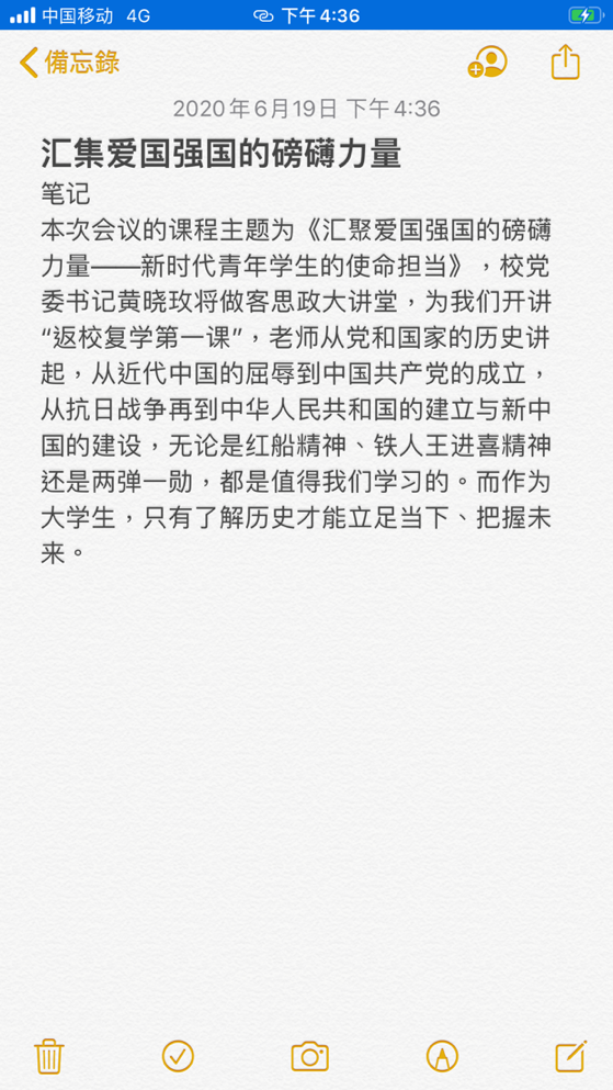 回顾这堂生动的思政大课,041182班乔翔宇谈到,黄晓玫老师通过对中国在近现代发展的崎岖路程的回顾,展现了红船精神、铁人精神、大庆精神和两弹一星等精神,阐述了中国共产党是爱国主义精神最坚定的弘扬者和实践者。在此次全民抗击疫情期间,全国上下表现出了前所未有的团结和凝聚力,即使是当初被称作“垮掉的一代”的90后、00后也在疫情中战胜了恐惧,在工作中担起了自己的责任。新时代青年要认识到自己所肩负的责任和担当,在当下吸收知识的阶段,认真学好专业知识,将言语转化为行动,不断提升自身各方面的能力,提高综合素质,谨遵校训,向杰出的地大人学习,在自己的领域上深入研究,为学校、社会和国家做出贡献。