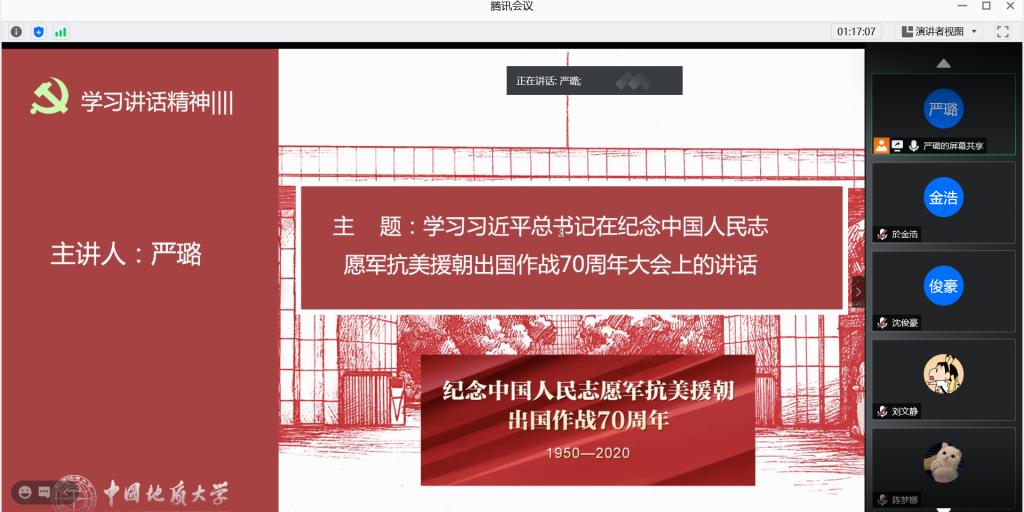 环境工程专业大学生党支部陈一帆同志带领支部党员学习习近平总书记在纪念中国人民志愿军抗美援朝出国作战70周年大会上的讲话,通过6个数字:三个“始终没有忘记”、五个“经此一战”、四个“无论是带如何发展”、五个“铭记”、三个“根本行不通”、两个“绝不会”来解读习总书记的重要讲话。他提出,习总书记的讲话全面回顾了抗美援朝战争的伟大胜利和巨大贡献,深刻阐述了抗美援朝精神的历史意义和时代价值,揭示了抗美援朝战争的历史启示,并呼吁所有党员必须永续传承跨越时空、历久弥新的伟大抗美援朝精神,随后陈一帆同志邀请张乐、李铭宇、冯川玉和柳玲玉四位同志结合实际学习工作谈及自己对抗美援朝精神的看法及启示,四位同志积极发言并对爱国主义精神、革命主义精神、革命乐观主义精神、革命忠诚精神和国际主义精神发表自己的见解并积极将伟大抗美援朝精神落实于生活实际当中。