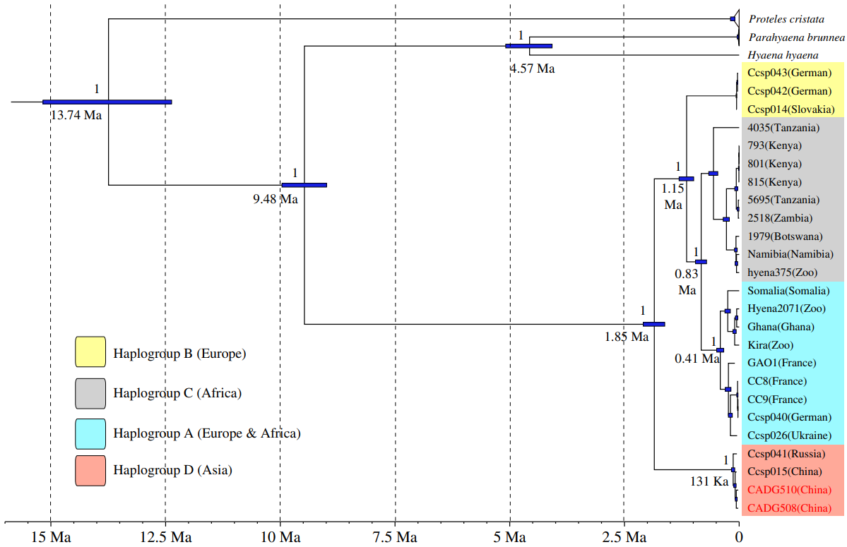 洞鬣狗是现生斑鬣狗的近亲,于更新世活跃在整个欧亚大陆,现已灭绝,其灭绝过程中的种群迁移演化历史尚不明确。本研究获取了我国东北晚更新世两个洞鬣狗个体的线粒体基因组,将洞鬣狗在亚洲的绝灭时间推后了2万年;确定东北洞鬣狗个体所代表的遗传支系与欧洲及非洲支系的演化分歧时间为距今约185万年。研究还认为,相比现生斑鬣狗、棕鬣狗和土狼,洞鬣狗有更高的线粒体遗传多样性;斑鬣狗属的母系有效种群数量在过去的40万年经历了两次明显的下降。