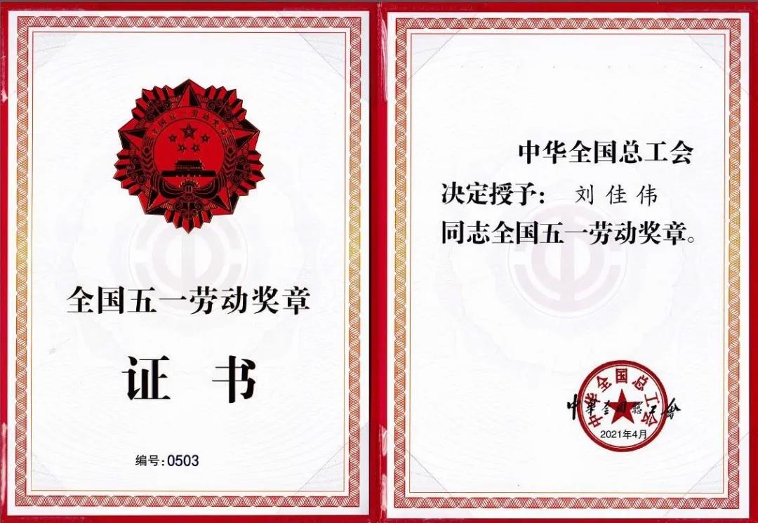 刘佳伟获2021年“全国五一劳动奖章”