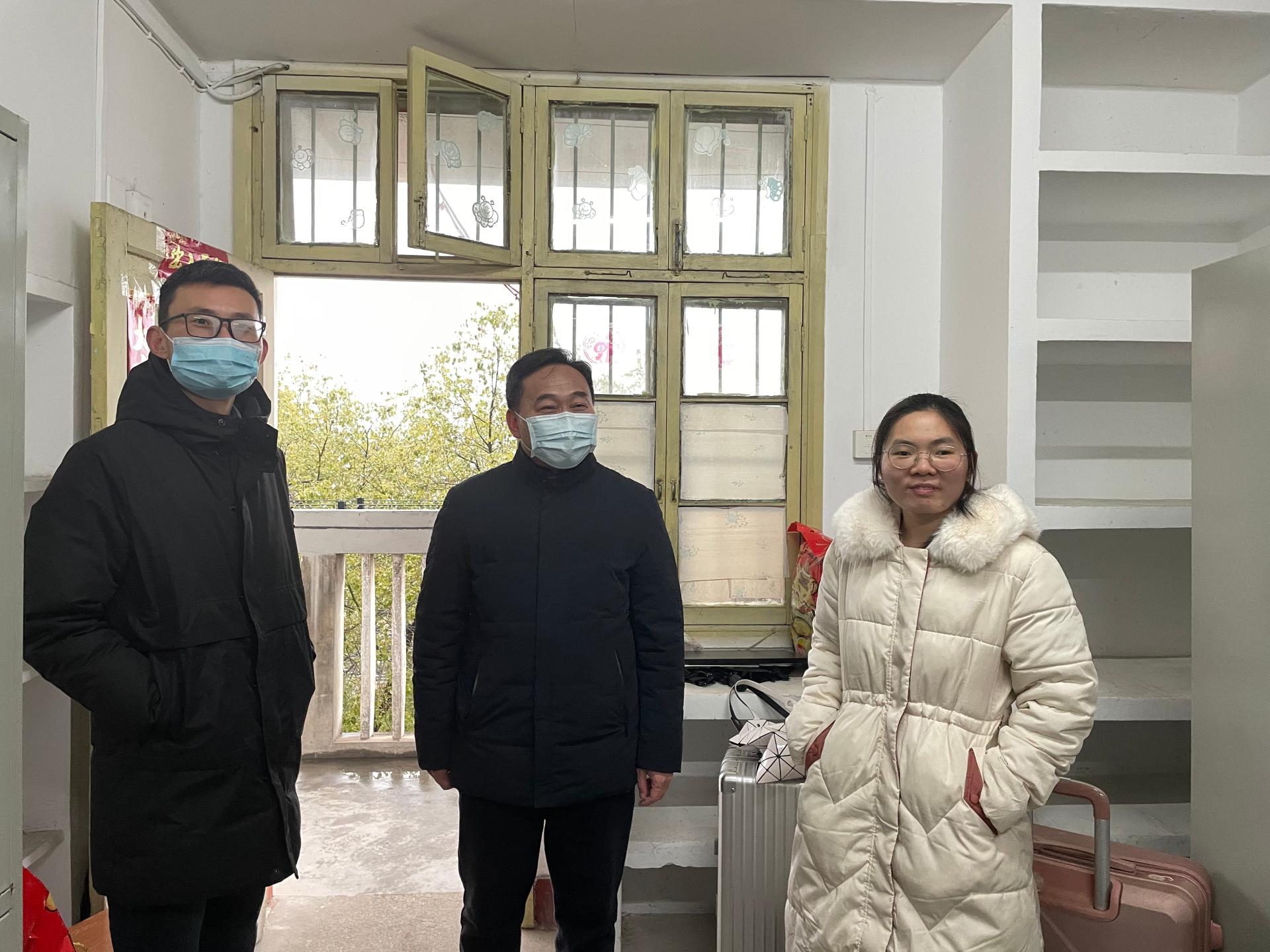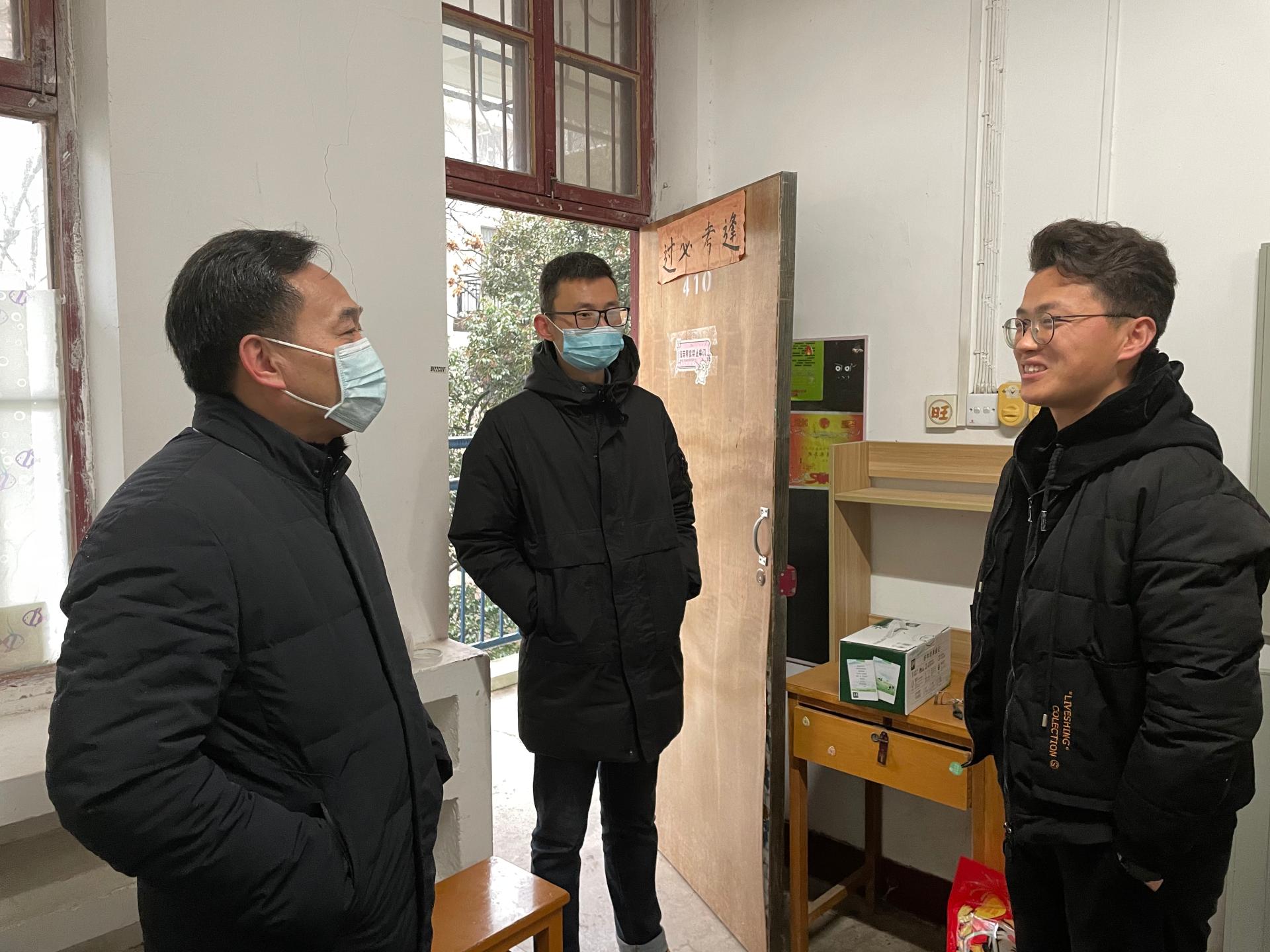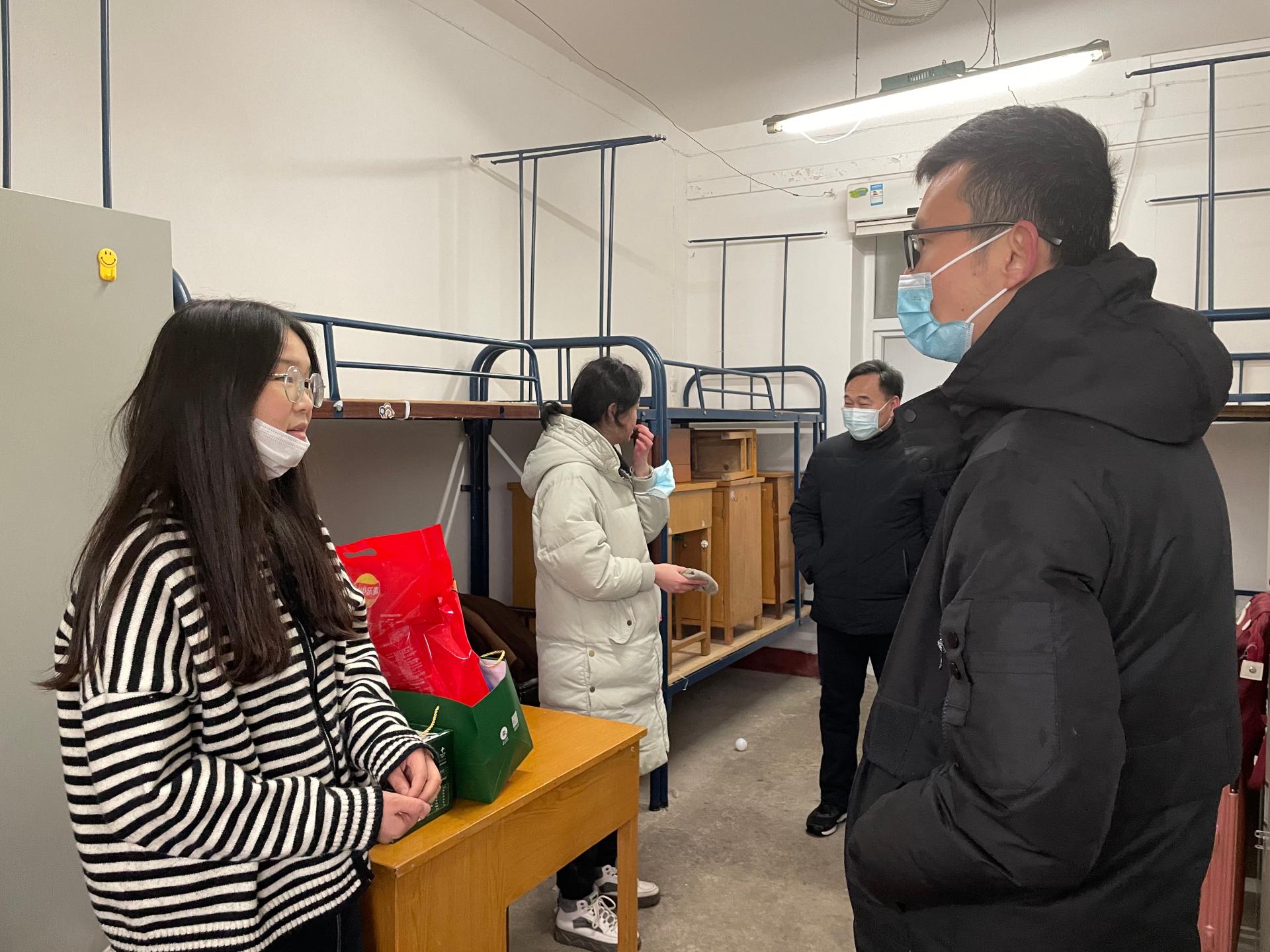 (通讯员孟庆达 摄影/编辑耿婧)1月28日下午,学院党委书记李素矿,党委副书记王海锋,中加合作办公室学生事务秘书耿婧前往南望山校区54栋、57栋学生宿舍看望春节留校的5名研究生,代表学院送上新春祝福。