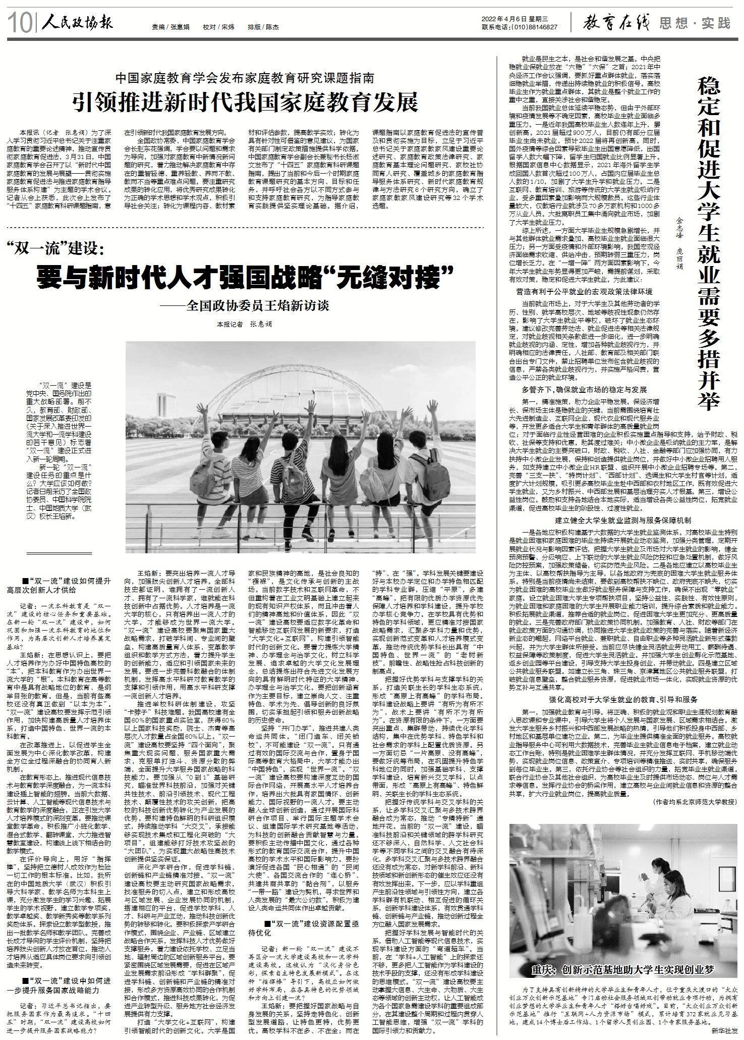 王焰新:要突出培养一流人才导向,加强拔尖创新人才培养。全部科技史都证明,谁拥有了一流创新人才、拥有了一流科学家,谁就能在科技创新中占据优势。人才培养是一流大学的核心,只有培养出一流人才的大学,才能够成为世界一流大学。“双一流”建设高校要聚焦国家重大战略需求,打破学科间、专业间的壁垒,构建高质量育人体系,变革教学组织和教学方式方法,着力提升学生的创新能力,适应和引领国家未来的发展。要进一步完善科教融合的体制机制,发挥高水平科研对教育教学的支撑和引领作用,用高水平科研支撑一流创新人才培养。