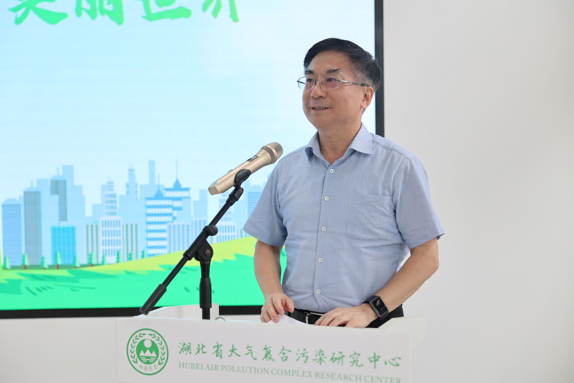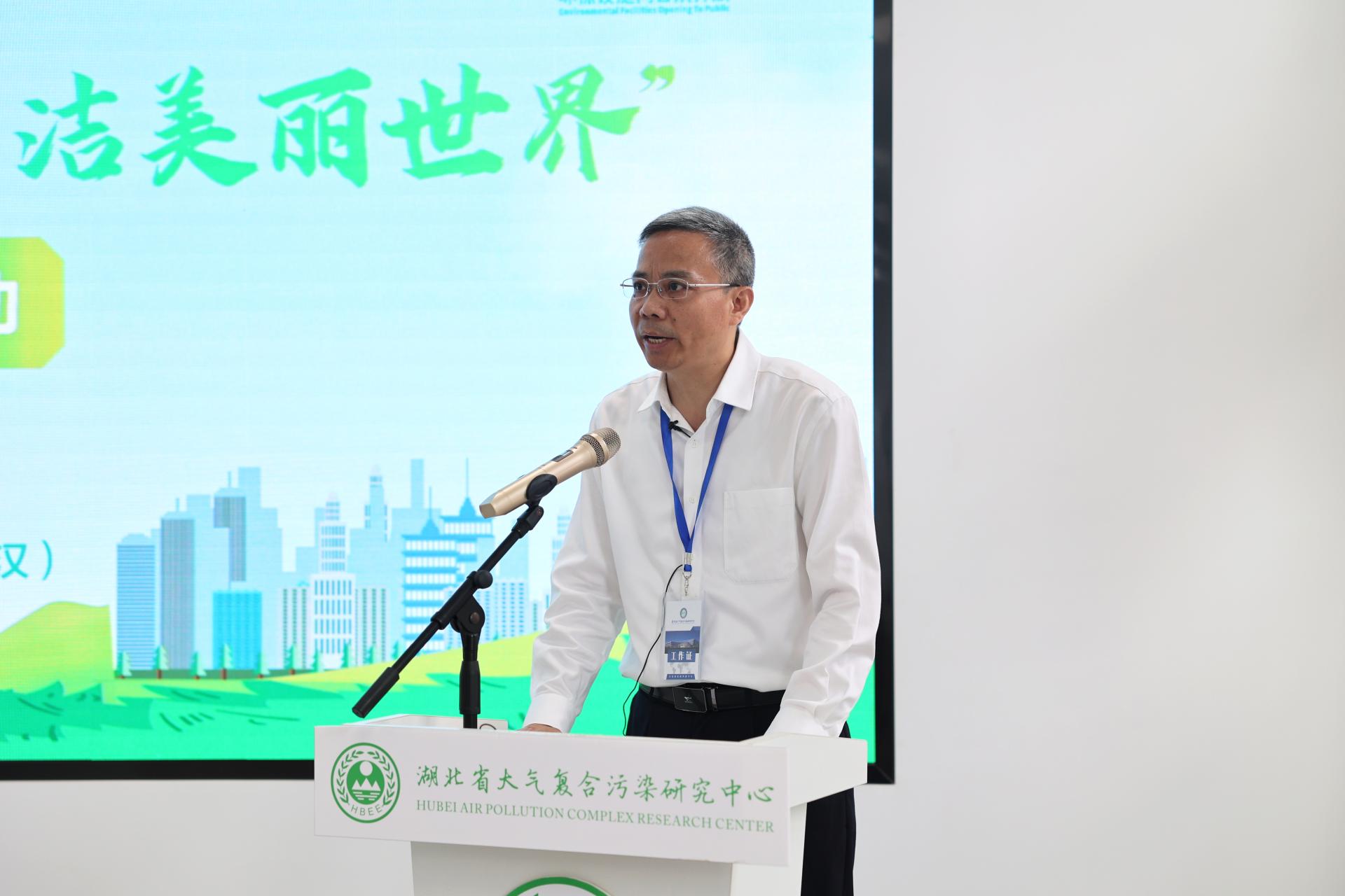 何开文致辞。他指出,湖北省生态环境系统认真贯彻落实省委“建设美丽湖北,实现绿色崛起”部署要求,积极助力绿色低碳发展,深入开展污染防治攻坚,系统推进长江保护修复,着力构建现代环境治理体系,全省生态环境发生了历史性变化。作为厅校合作的新模式,湖北省大气复合污染研究中心(以下简称“中心”)多次向公众开放,已成为社会公众了解湖北省大气污染防治工作的一个重要窗口,是环境科普工作的一个重要基地。他对中心在“十三五”期间,为湖北省打好、打赢蓝天保卫战提供的系统技术保障表示充分肯定,同时对中心在开展细颗粒物和臭氧协同防控、减污降碳、应对气候变化做好强大技术支撑等领域提出新要求。他强调,大家应一起行动,做生态文明理念的积极传播者和模范践行者,并着力推动经济社会发展全面绿色转型,统筹污染治理、生态保护、应对气候变化,努力建设人与自然和谐共生的美丽中国。