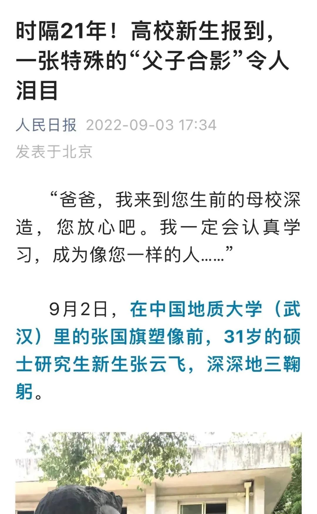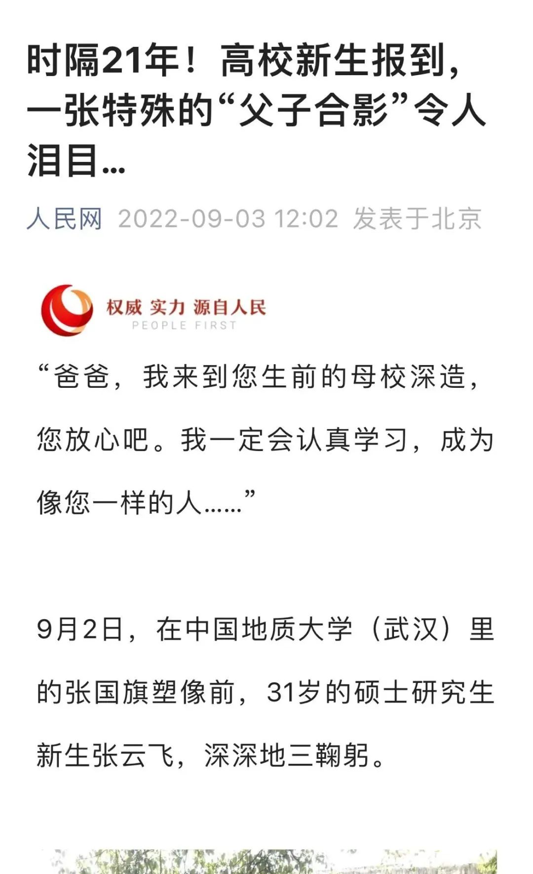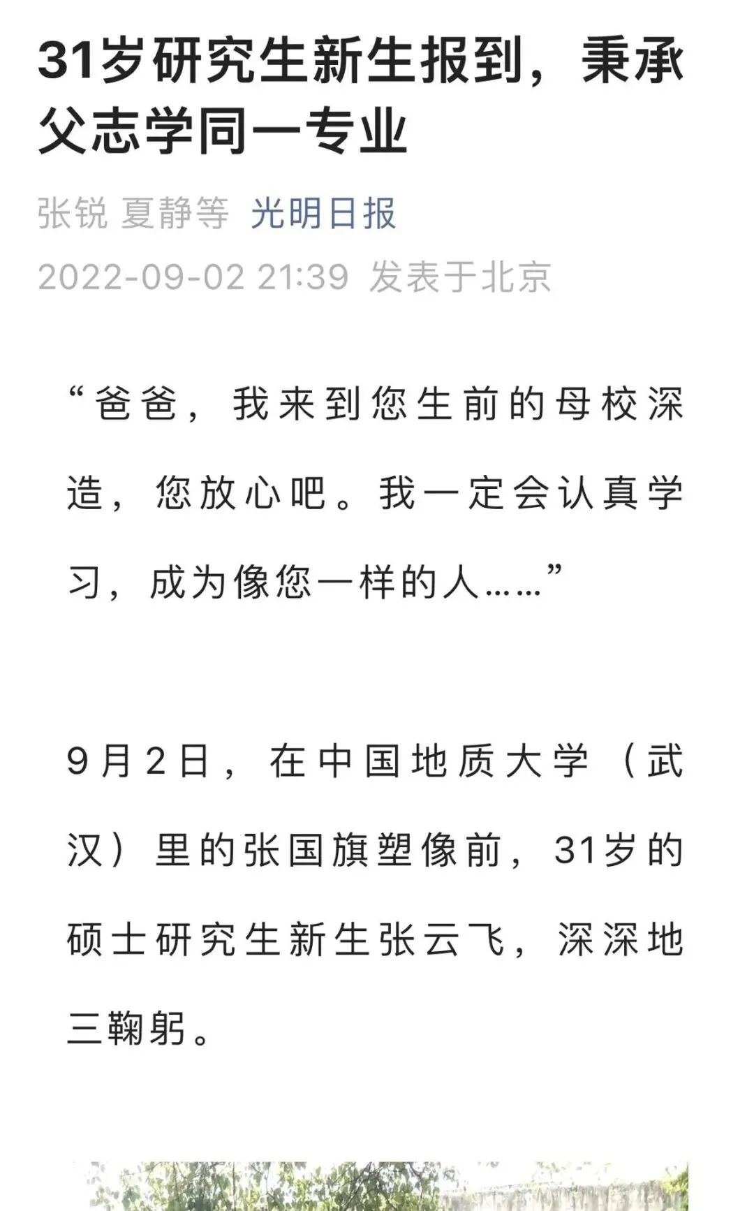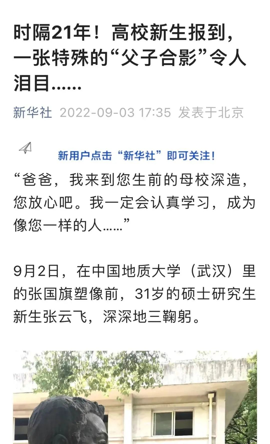 9月2日,中国地质大学(武汉)新生开学季,在报到的新生群体中,一名31岁的硕士研究生新生,在校园内的一尊雕像前,深深地三鞠躬后,默默地说道:“爸爸,我来到您生前的母校深造,您放心吧,我一定会认真学习,成为像您一样的人……”