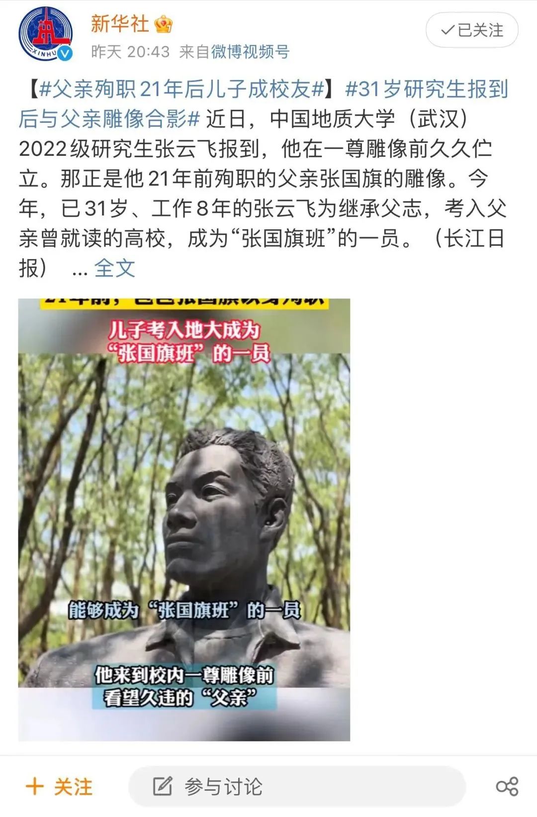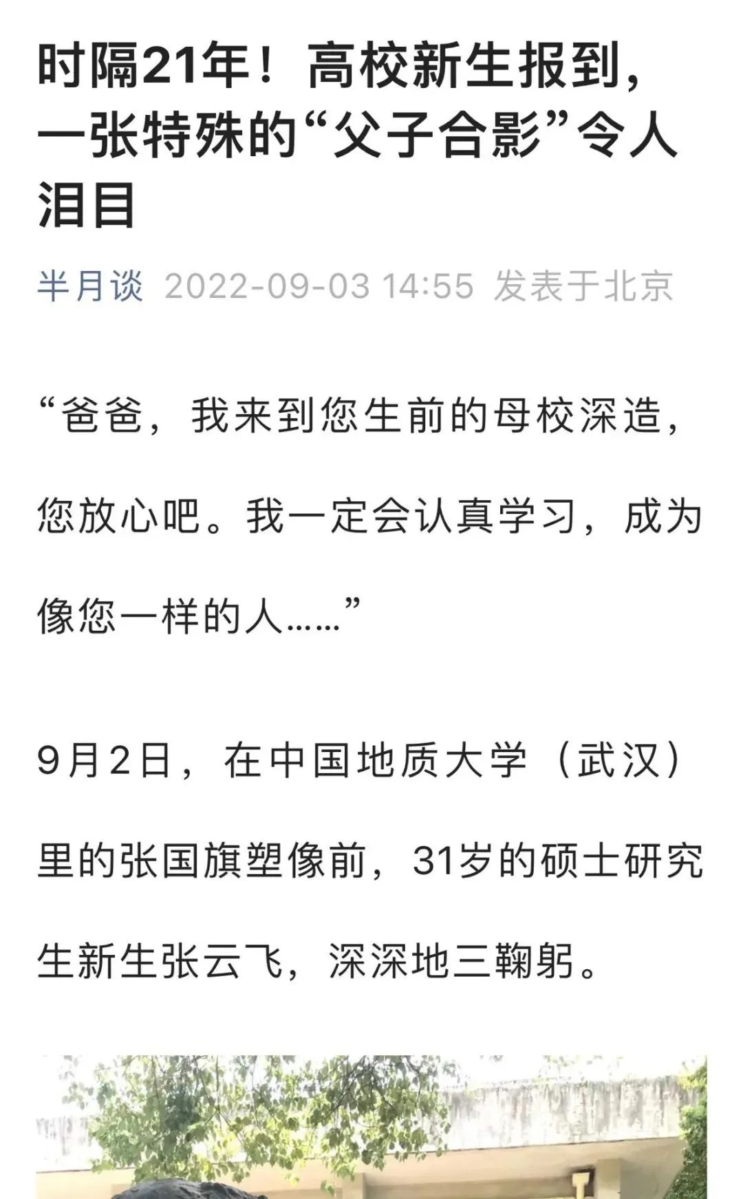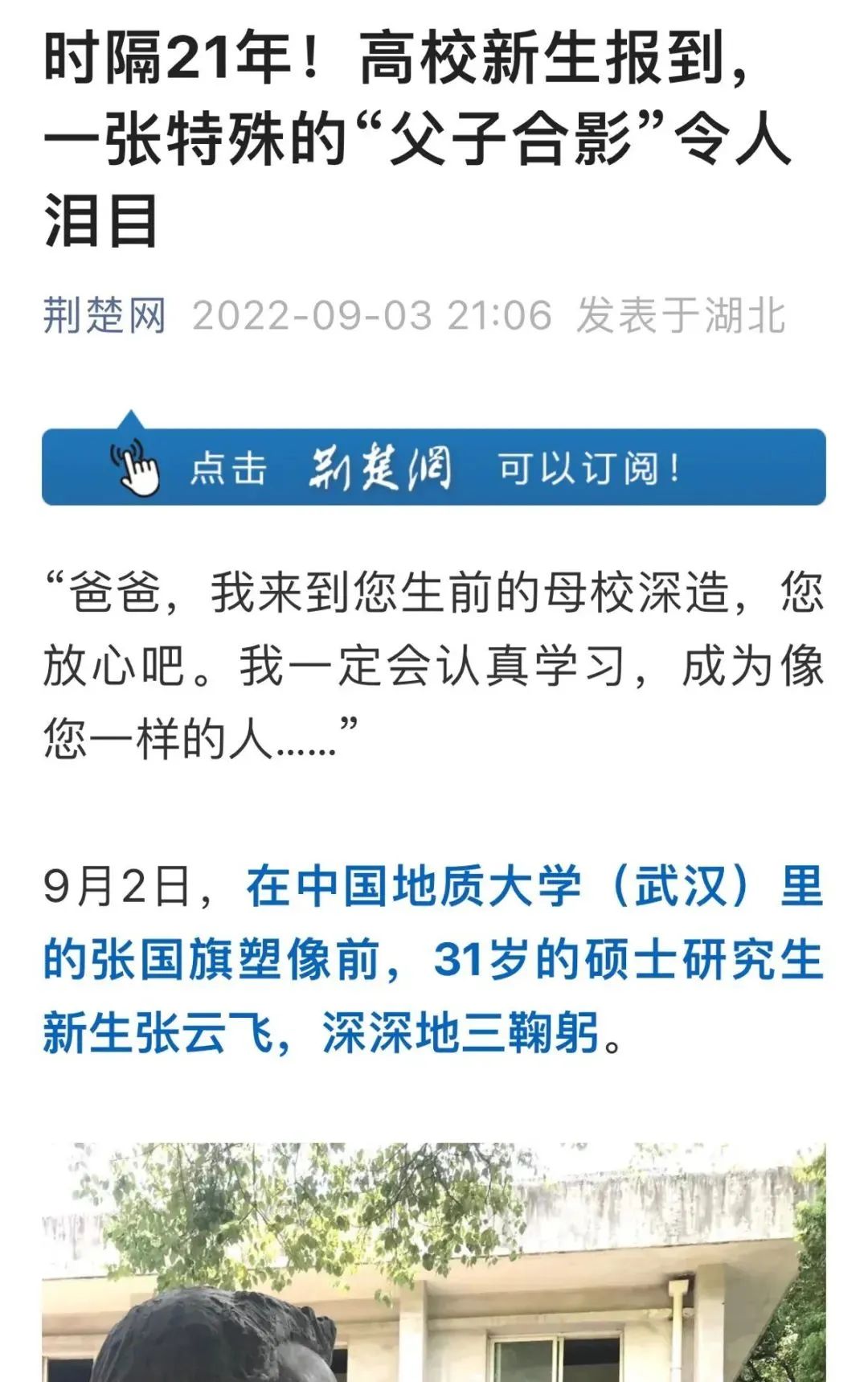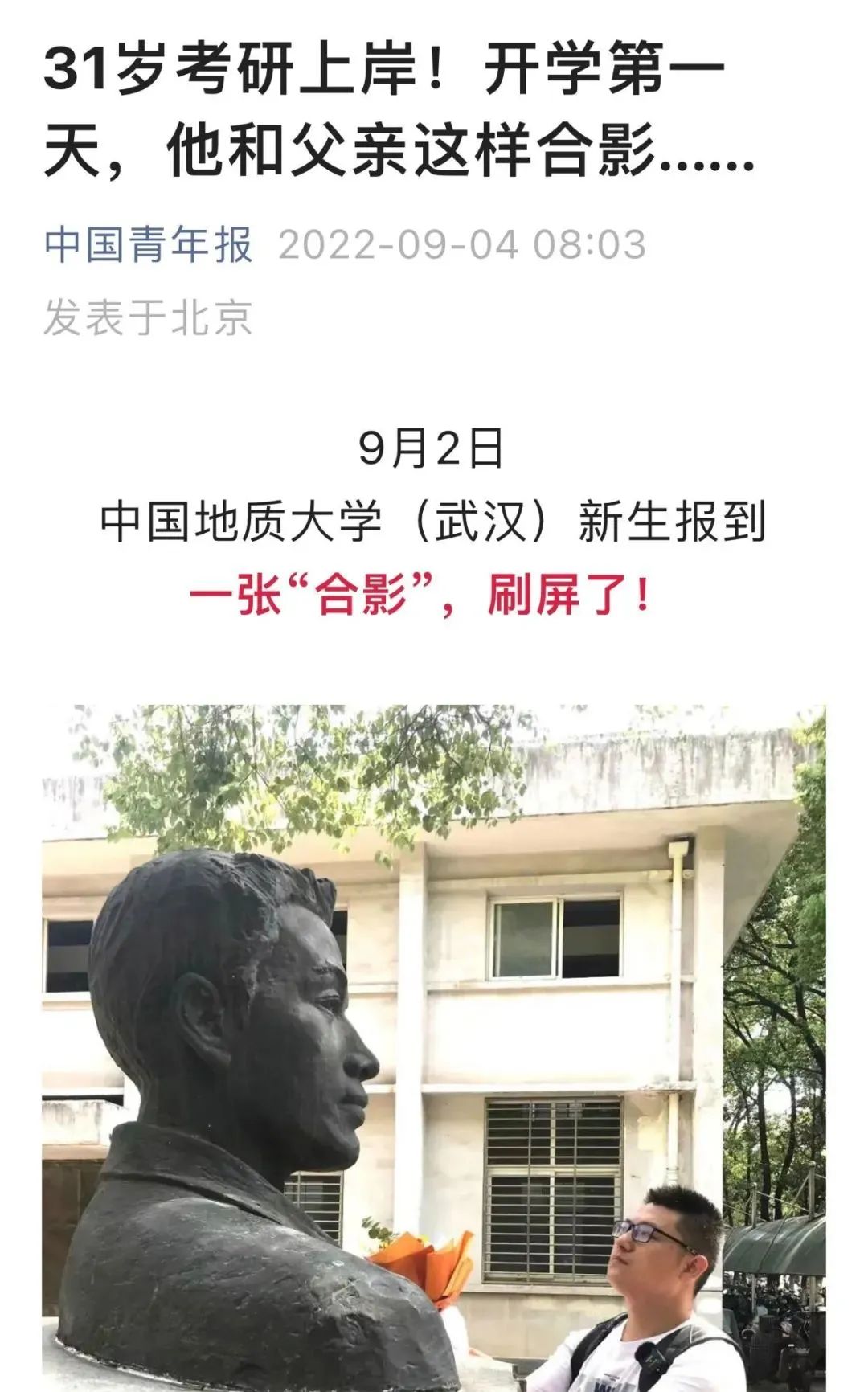 9月2日,中国地质大学(武汉)新生开学季,在报到的新生群体中,一名31岁的硕士研究生新生,在校园内的一尊雕像前,深深地三鞠躬后,默默地说道:“爸爸,我来到您生前的母校深造,您放心吧,我一定会认真学习,成为像您一样的人……”