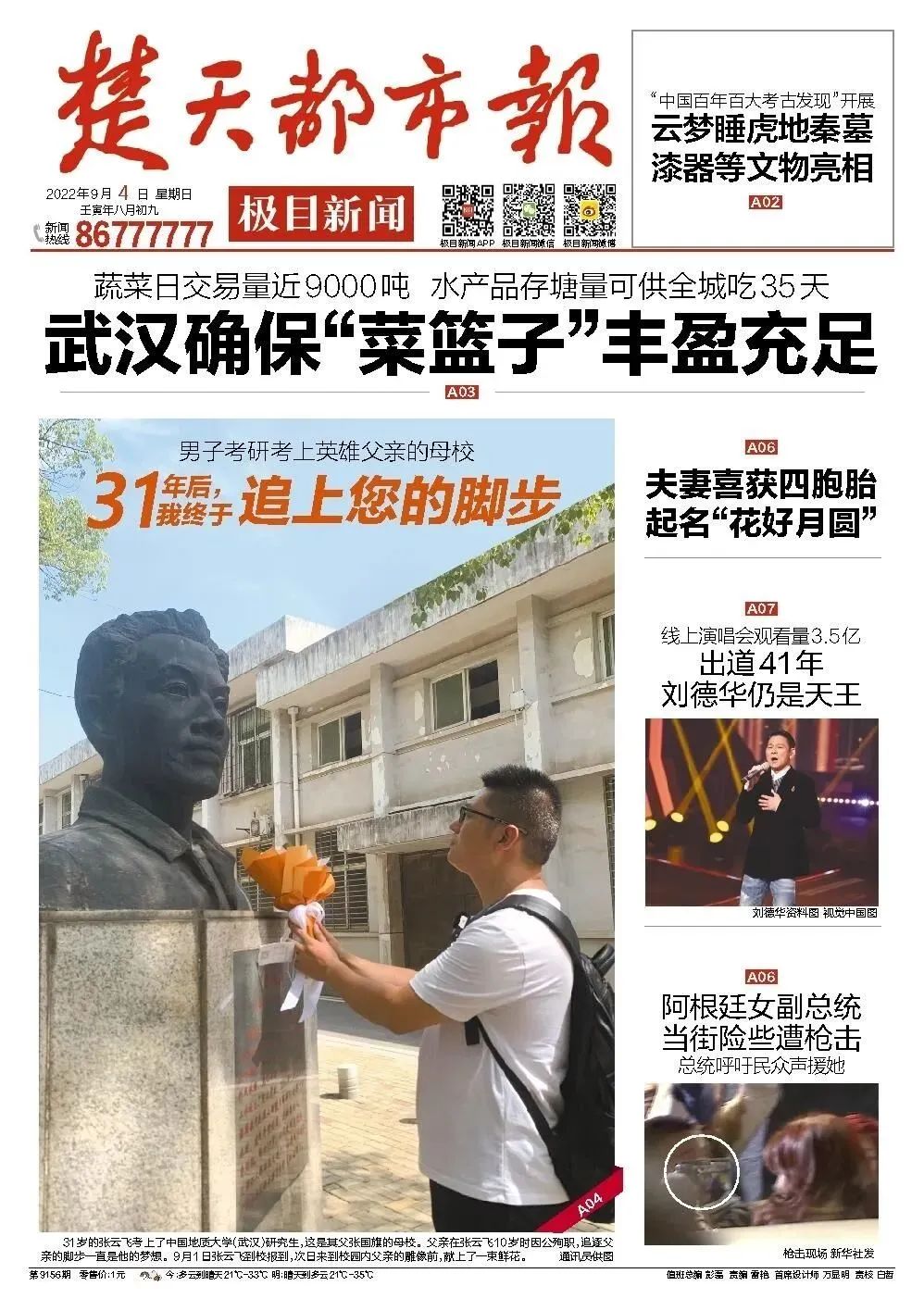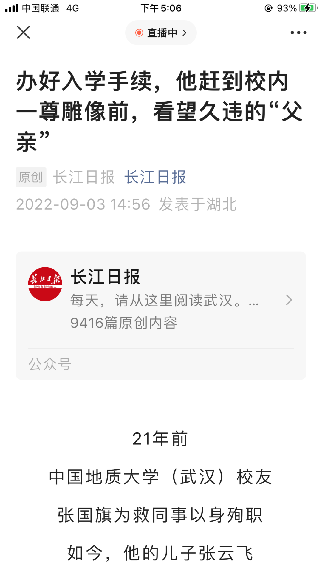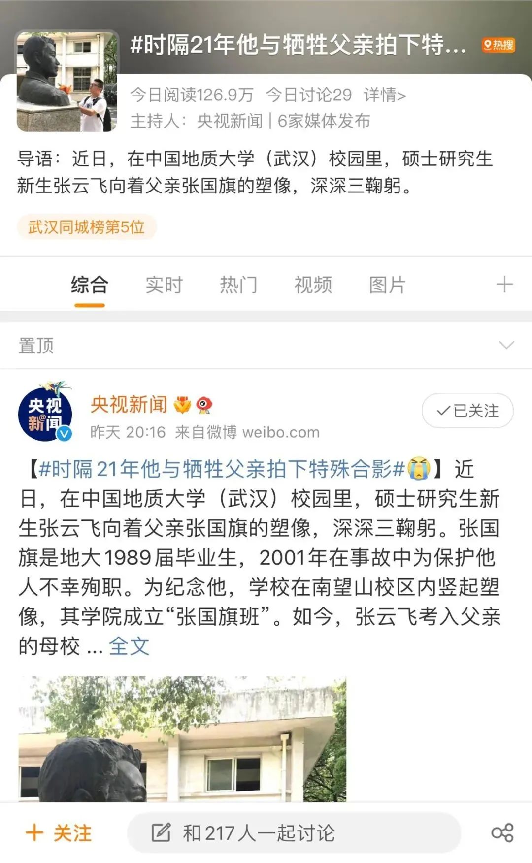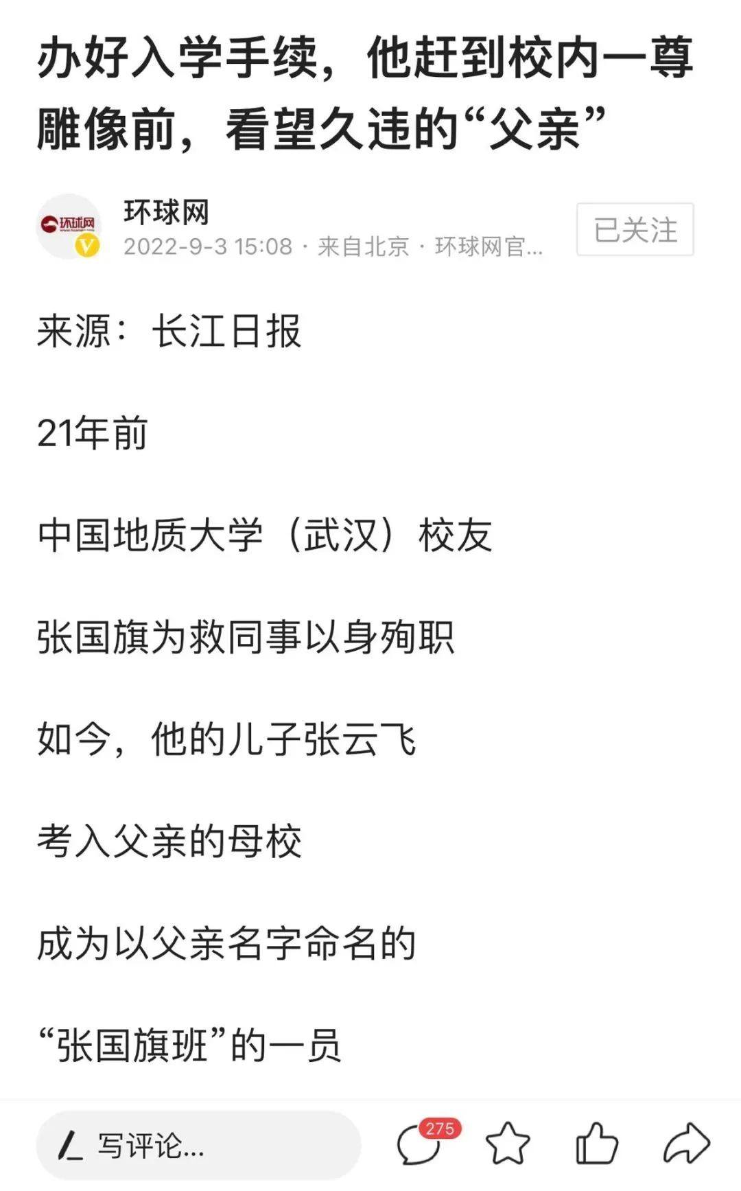 9月2日,中国地质大学(武汉)新生开学季,在报到的新生群体中,一名31岁的硕士研究生新生,在校园内的一尊雕像前,深深地三鞠躬后,默默地说道:“爸爸,我来到您生前的母校深造,您放心吧,我一定会认真学习,成为像您一样的人……”
