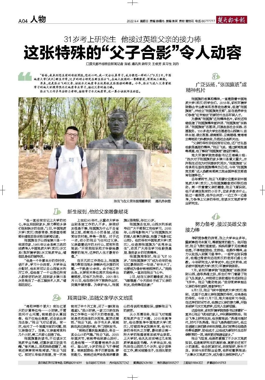 在中国地质大学(武汉)即将迎来70周年校庆前夕,9月2日是该校的新生开学季,英雄校友张国旗之子张云飞,大学毕业工作八年后,已经31岁的他,接过父亲的水文地质学接力棒,来校报到攻读硕士研究生。党委宣传部记者根据新闻线索,进行深入挖掘和采访,撰写长篇新闻通讯,全文如下: