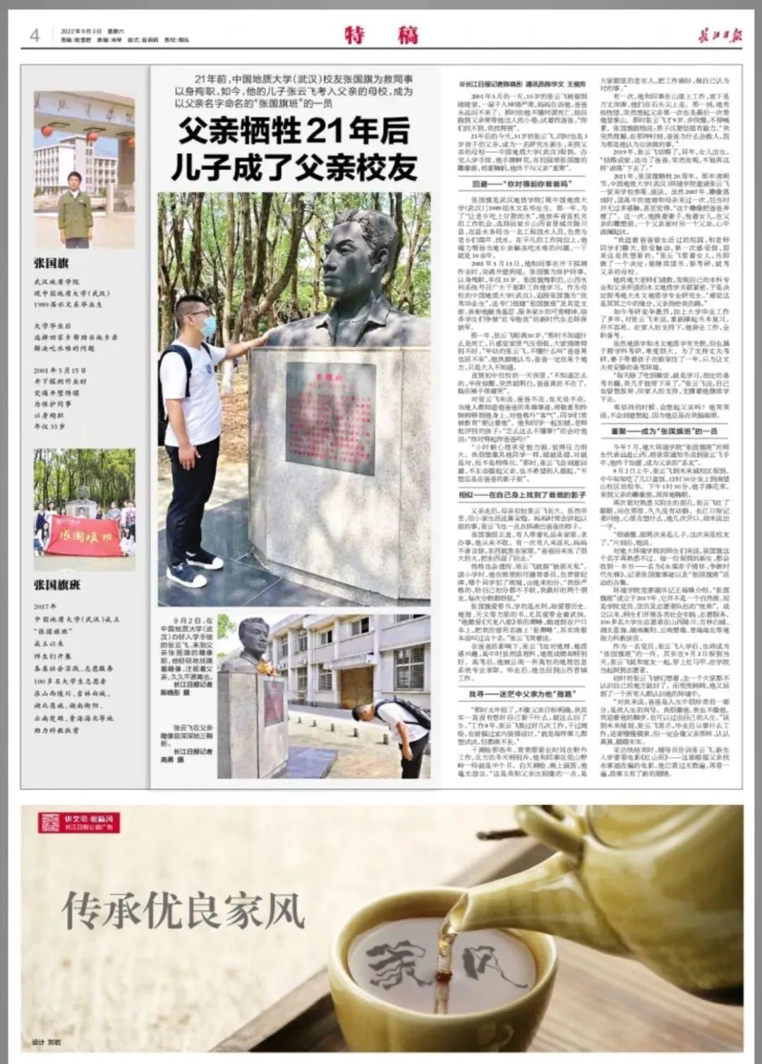 张云飞在父亲张国旗雕像前。
