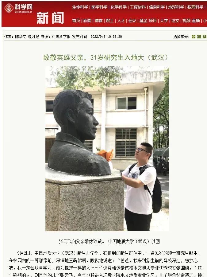 9月1日,张云飞来到中国地质大学(武汉)。今后,这里不仅是父亲张国旗的母校,将来也是他的母校。不久后的11月7日,这所大学将迎来校庆70华诞。在这样的时间节点,他接过英雄父亲的接力棒,开始系统学习水文地质学,阔步人生新征程。