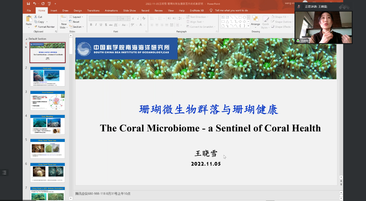 在交流互动环节,王红梅教授、侯圣伟教授、李平一副研究员等多位老师同学分别对珊瑚微生物群落环境变化的驱动因素、LodAB应对双氧水降解基因的机理和弧菌导致珊瑚组织脱落的机理等展开讨论,王晓雪研究员就提出的问题详细解答,会议气氛十分活跃。