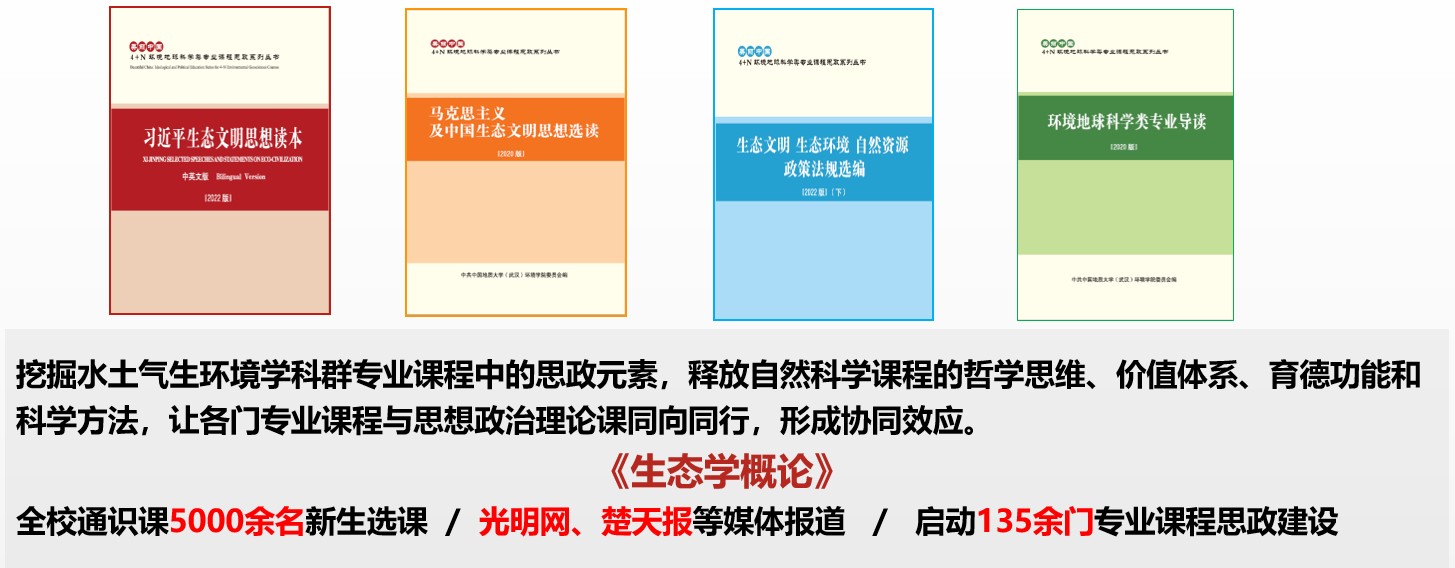 学院充分挖掘水土气生环境学科群专业课程中的思政元素,将知识传授、能力培养与价值引领有机融合,推出美丽中国“4+N”环境地球科学类课程思政模式,即《习近平生态文明思想读本》《马克思主义及中国生态文明思想选读》《生态文明 生态环境 自然资源 政策法规选编》《环境地球科学类专业导读》四本环境地球科学类课程思政系列丛书和覆盖135门专业课程的课程思政体系。四本指导教材已经在每年全校5000余名学生中使用。通识课《生态学概论》自2019年开讲以来,实现了全校本科生和留学生全覆盖,编印3册《生态学概论学习心得集锦》。