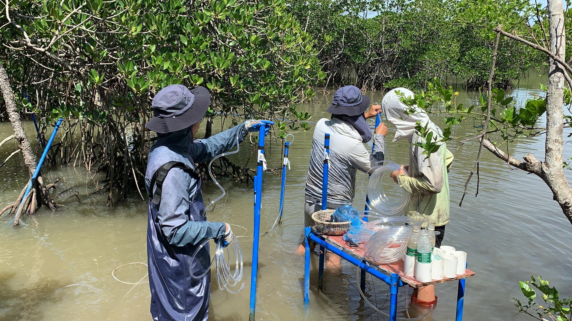 团队师生在海南红树林湿地进行水质监测