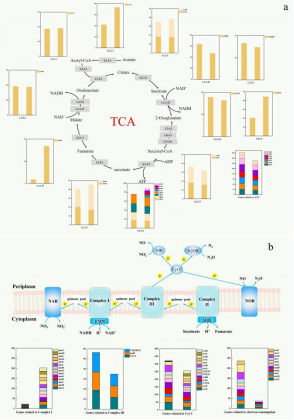 宏基因组学数据显示四环素对反硝化相关代谢过程关键基因的复制有抑制效果,包括三羧酸循环中生成ATP和电子供体的功能基因、电子传递系统相关基因、反硝化功能基因。