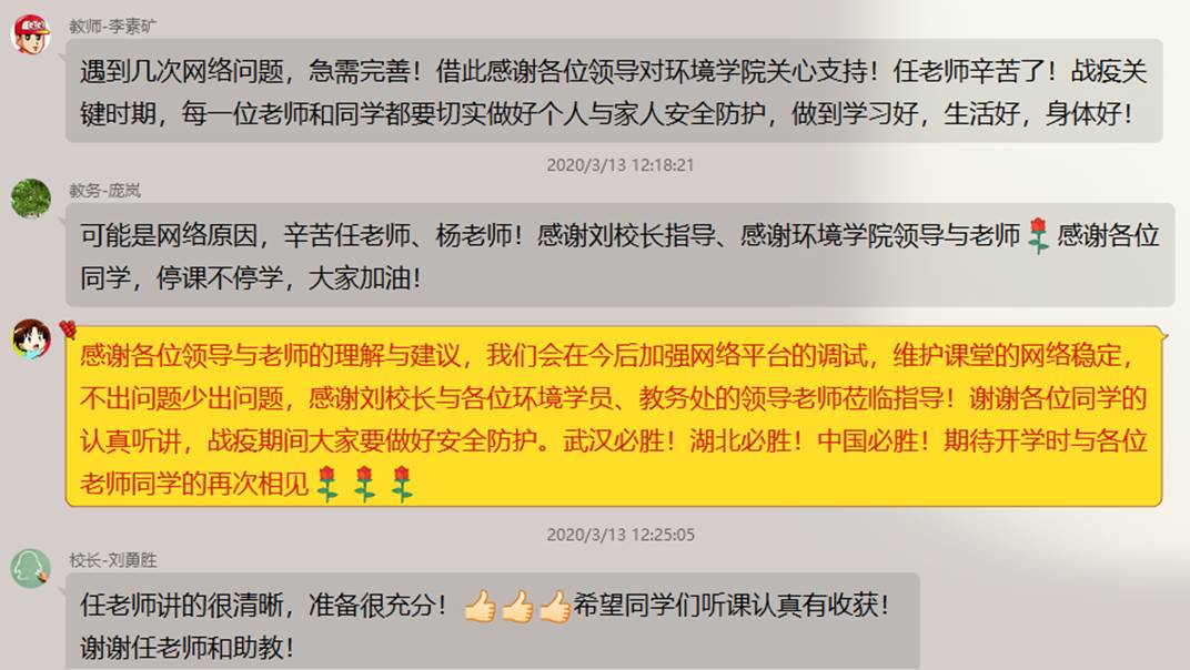 课后,众师生相互勉励,指出了线上教学的网络问题,也肯定了气候学团队的教学质量,同时不忘嘱托疫情期间的安全防护,为疫情期间的武汉带来一份温暖。