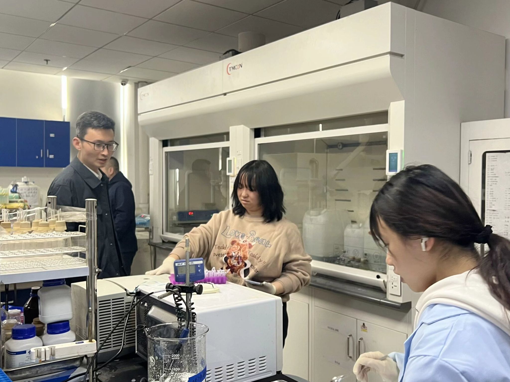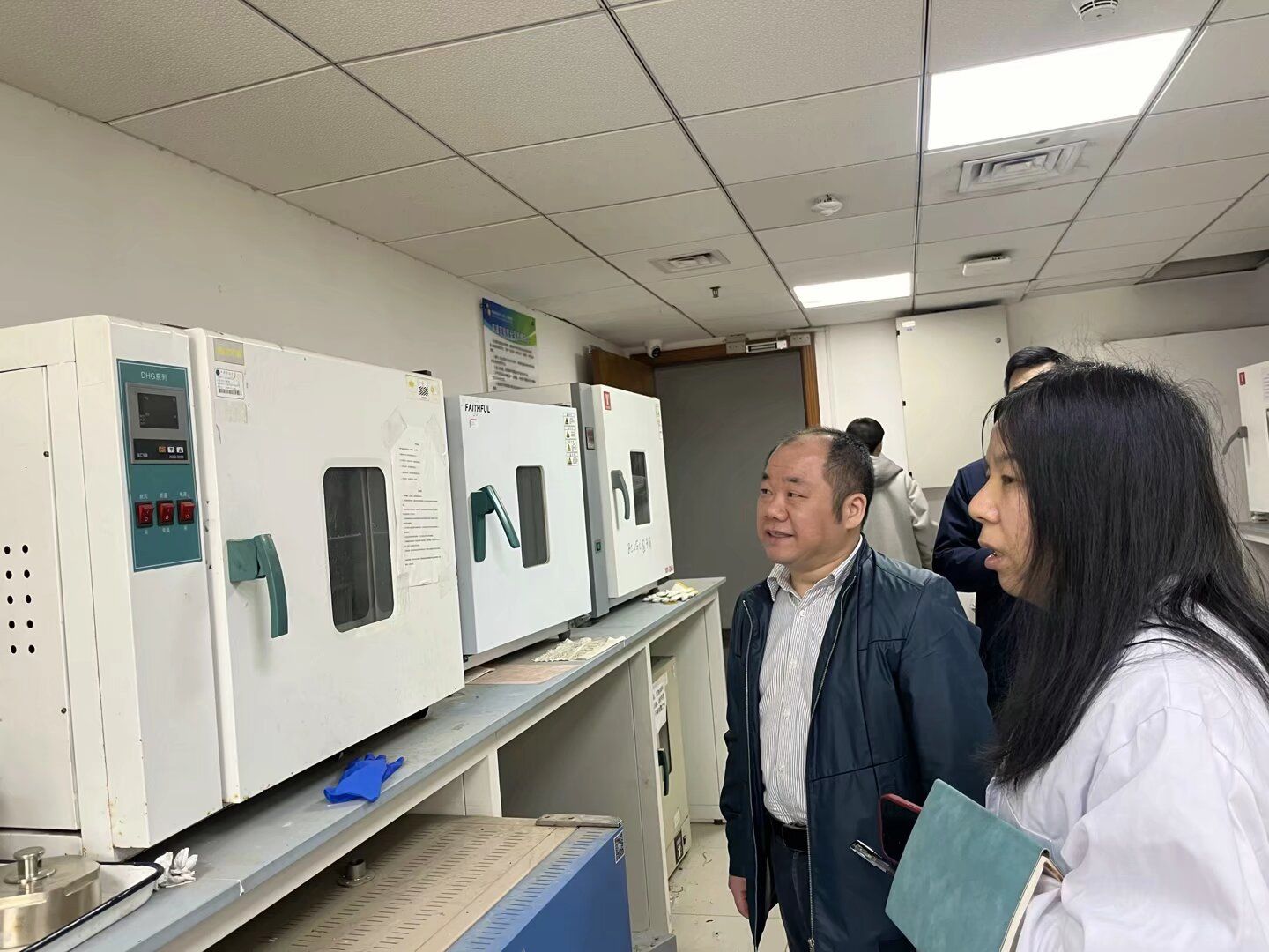 学院党委书记姜明敏、实验教学中心梁莉莉、辅导员赵恩民等检查走访研究生工作间、高温室等教学科研实验室。