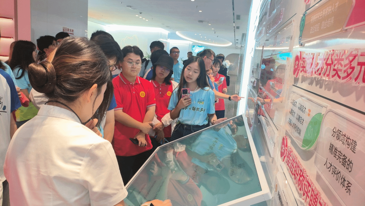 在康巴什区的现代能源研究中心,从煤炭清洁利用到风光氢储一体化沙盘,鄂尔多斯“由黑到绿”的能源转型路线图清晰呈现,实践队认真学习氢能产业链的进展,感受“产能+储能”的广阔前景。