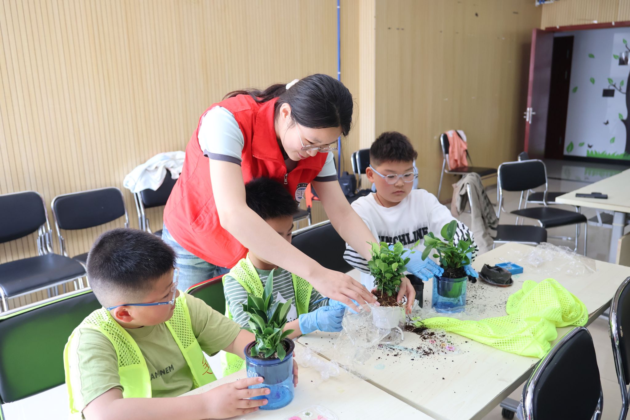 志愿者们带来生机盎然的绿植盆栽,带领孩子们一步步完成盆栽栽种。待孩子们种植完成后,志愿者为盆栽贴上专属姓名标签,陪同孩子们将满载心意的绿植安置在社区童心花园,以实际行动践行环保理念,为家园添新绿。