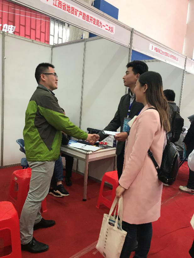 招聘会现场,在上海九澄环境工程有限公司展位前,副书记朱继认真询问了公司的岗位需求、待遇情况、发展前景等,研究生工作部副部长陈慧老师同学院校友单位江西省地质矿产勘查开发局九一二大队负责人深入交流,并向其推荐我院应届学生。
