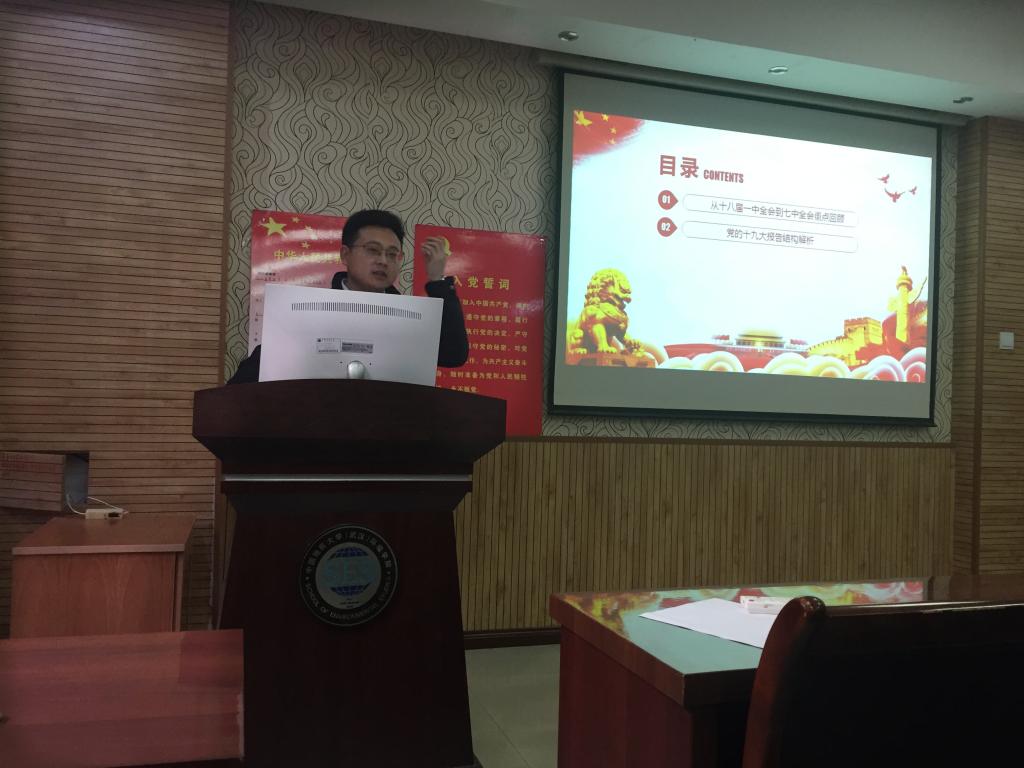 朱继从十八届一中全会到七中全会重点内容回顾,党的十九大报告结构解析,党的十九大报告内容精解三个部分进行报告宣讲,寄语党员干部要以习近平新时代中国特色社会主义思想为指引,不忘初心,牢记使命为实现中华民族伟大复兴的中国梦不懈奋斗,并结合学院学生工作实际,希望广大党员要有责任心、事业心、上进心,努力为学院谋发展,为同学谋进步,积极为学院张国旗班创建行动献计献策,争做时代先锋,永葆赤子之心。