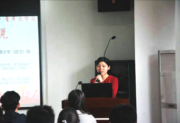 042152班团员唐钰婧以“为青春打上奋斗的底色”为主题讲述了自己对习近平重要讲话“广大青年生逢其时,也重任在肩”的理解。她说,环境青年要成为实现中华民族伟大复兴的生力军,成为美丽中国建设的重要参与者,肩负起国家和民族的希望。