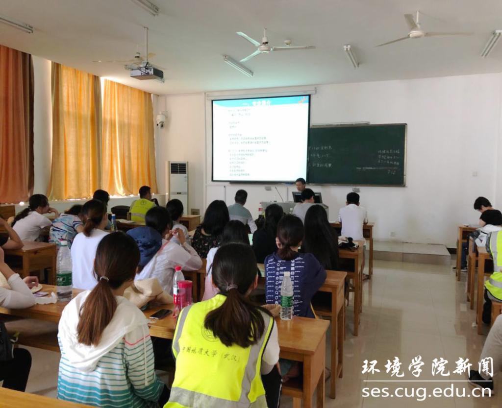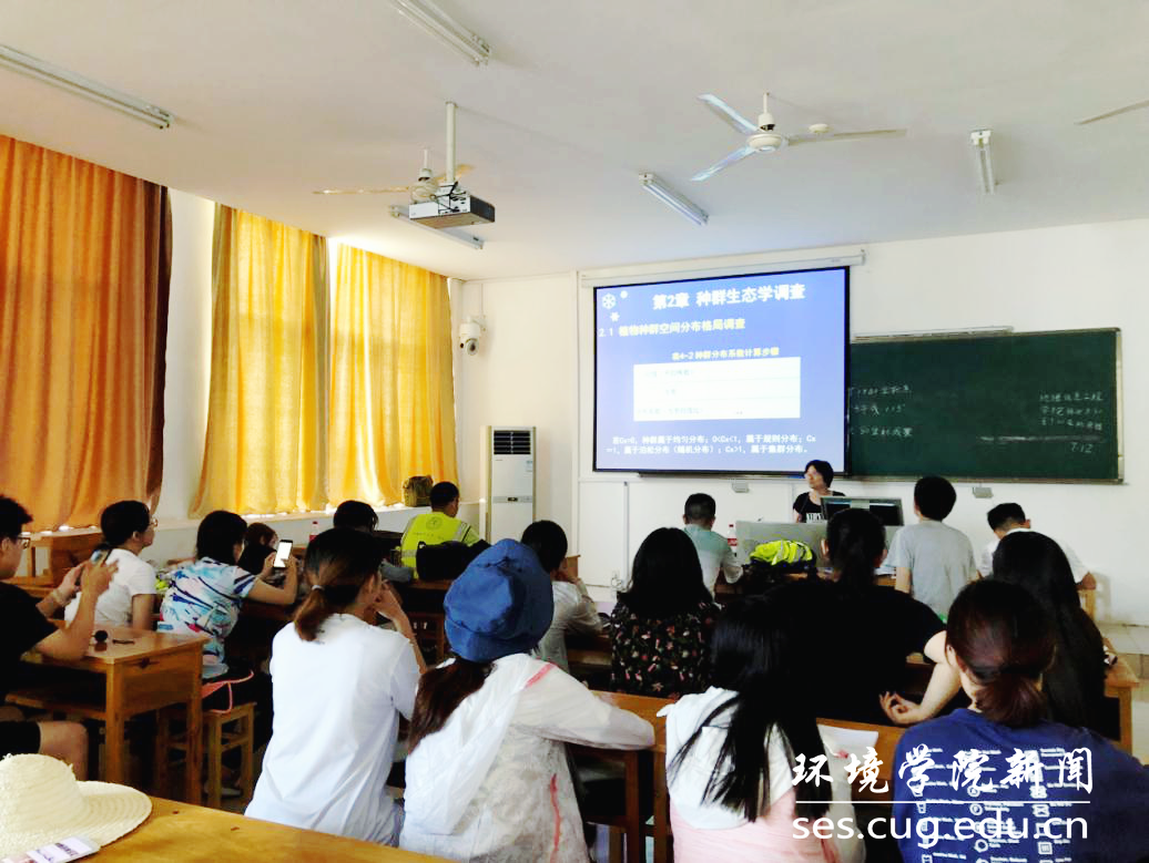 班会开始之前同学们刚刚结束一天的实习任务,带着汗珠就进了教室。程丹丹老师对实习当天在夔龙山开展的样方调查工作中涉及到的生态学理论知识点进行了讲解。
