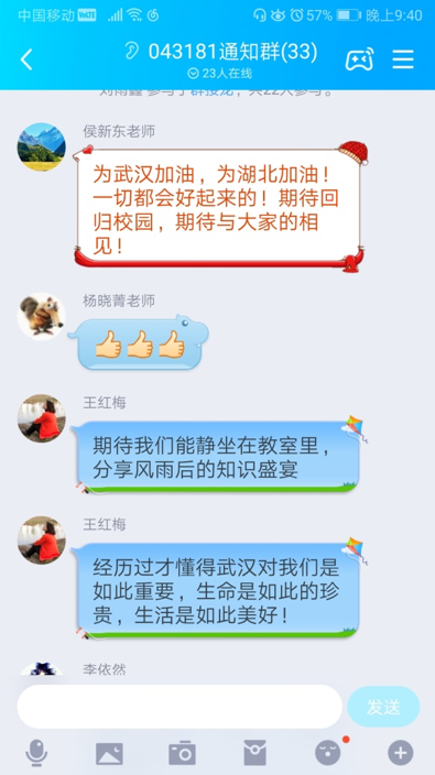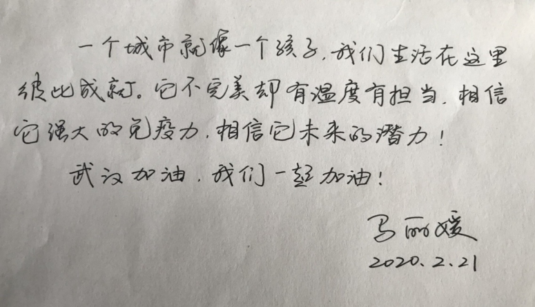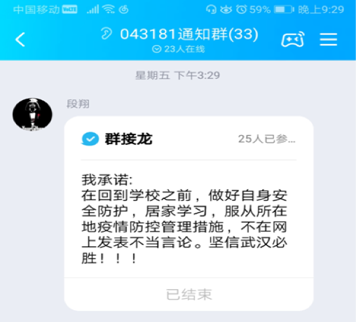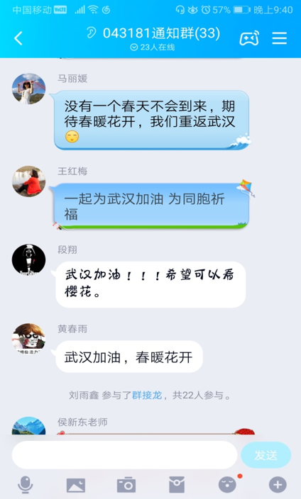 疫情,让00后有了人生新的记忆碎片。武汉是同学们的第二个家,同学们手写对武汉的祝福,通过群接龙的方式表达一份战疫承诺,因课程冲突等原因未能线上参会的生物科学系王红梅、杨晓菁、侯新东三位老师也和同学们一起表达对战疫必胜、武汉必胜的信心。